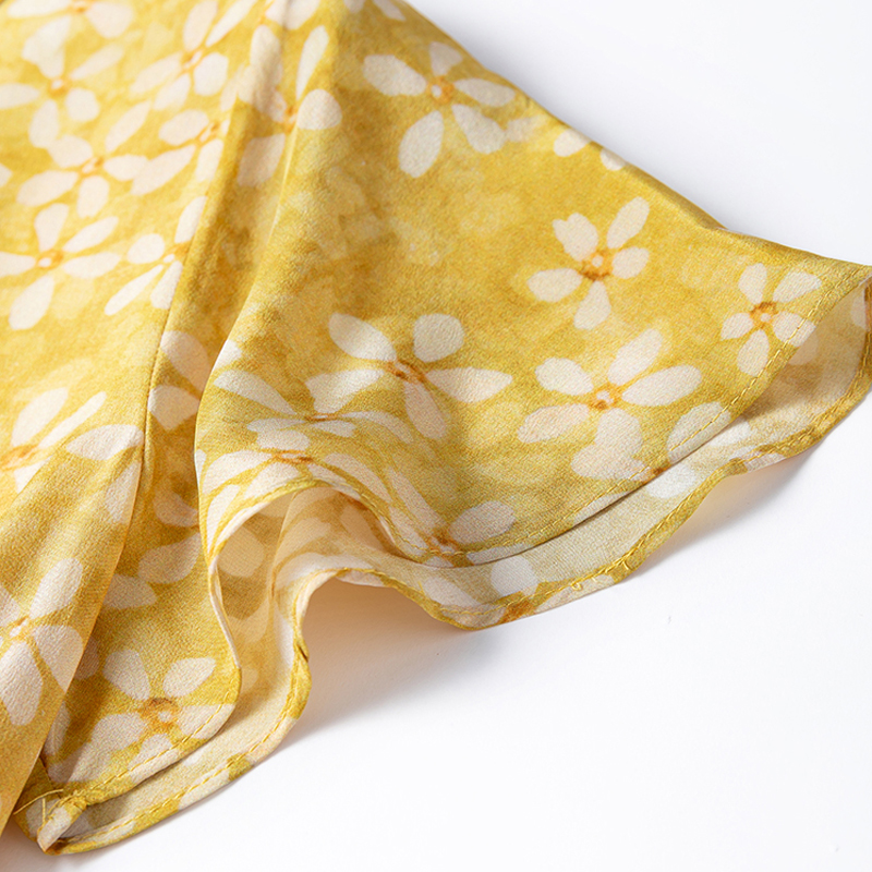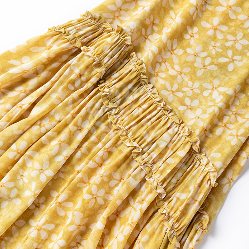 3.2米大摆“显白黄色水墨”真丝飞飞袖斜腰线长裙度假风连衣裙