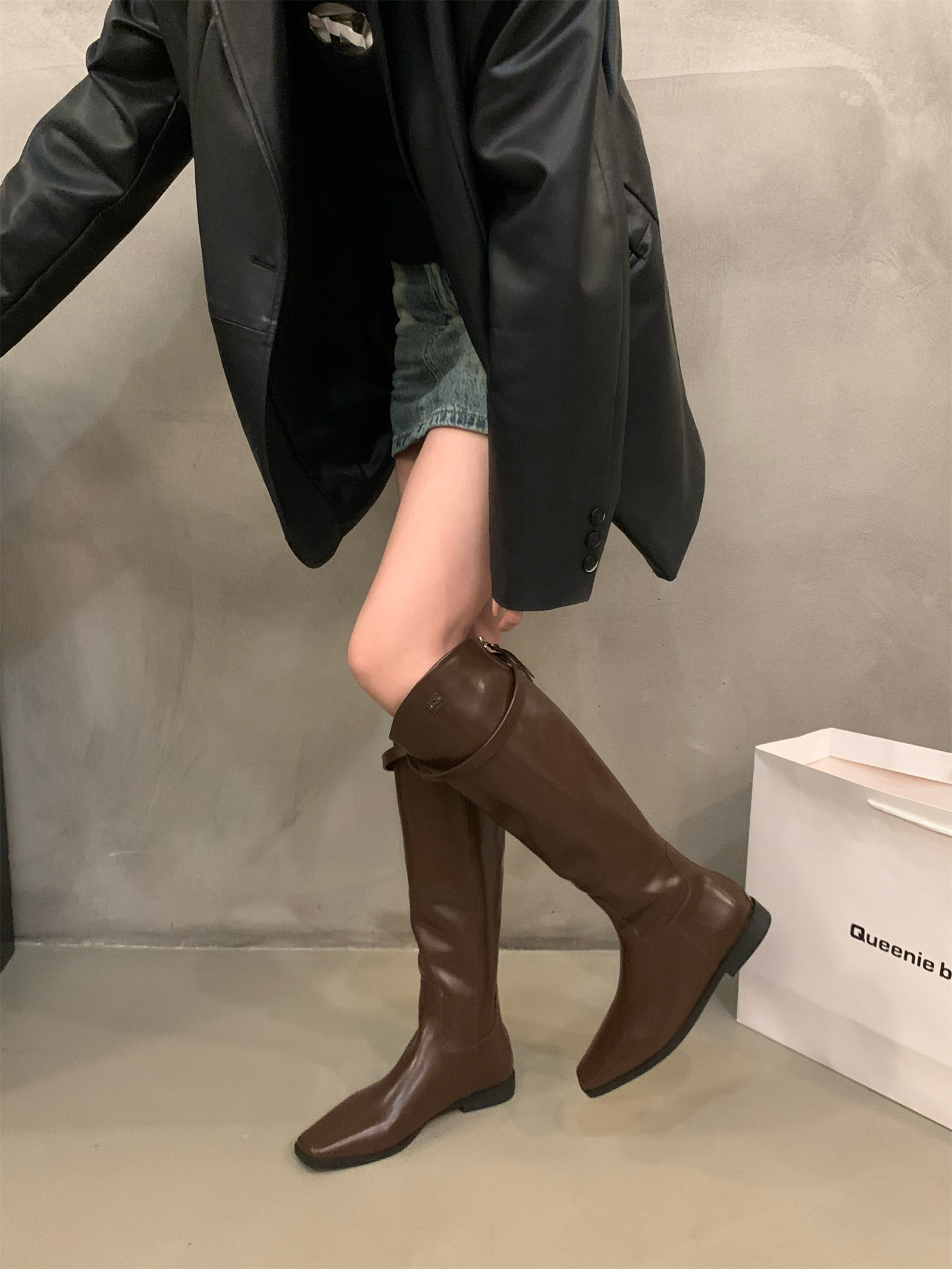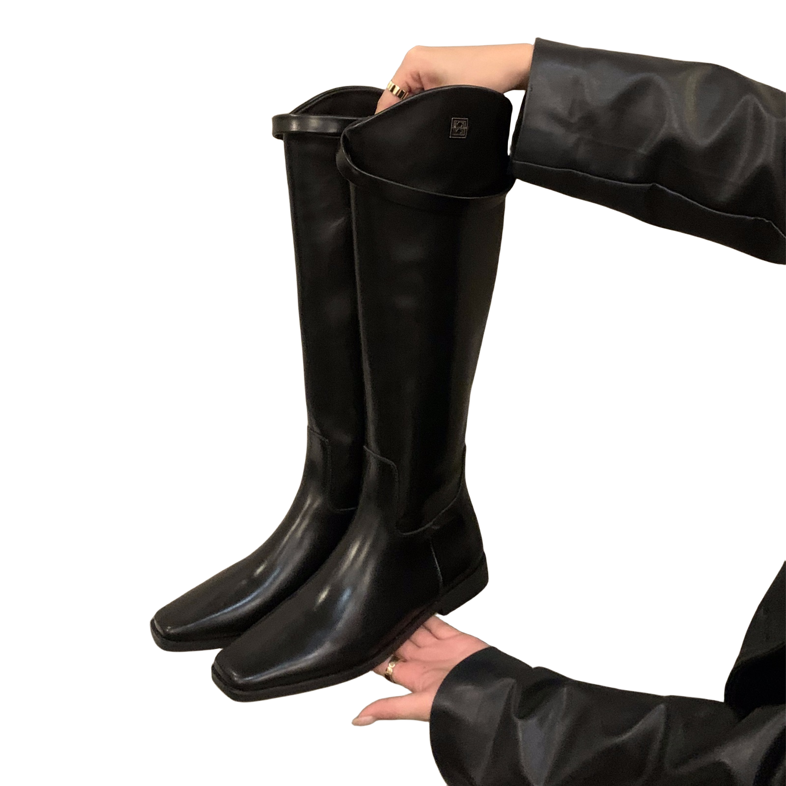 平底黑色直筒长靴女鞋2025年新款秋冬季方头V口中筒长筒骑士靴子