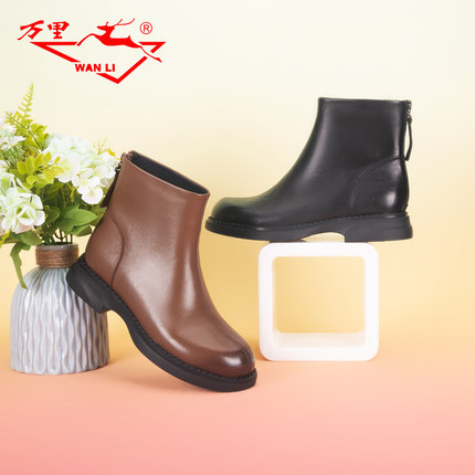 万里新款时尚后拉链短靴简约真皮低跟女靴舒适圆头高帮鞋HVT620