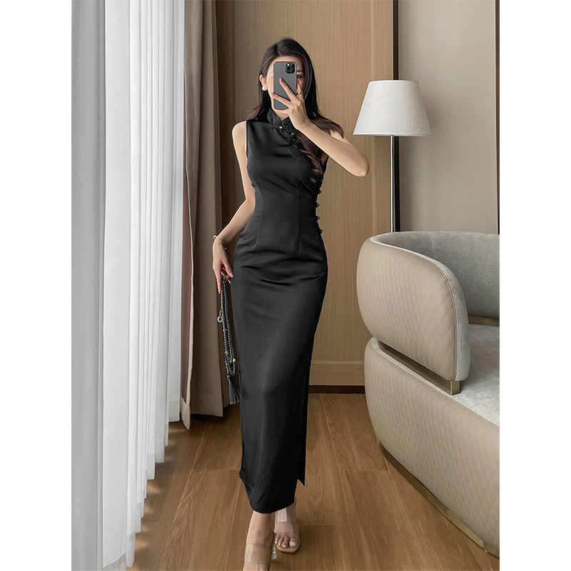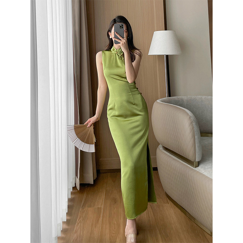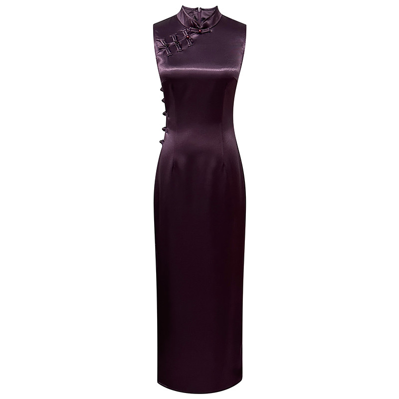 紫色新中式缎面旗袍女夏季新款高级感复古立领无袖开叉长裙连衣裙