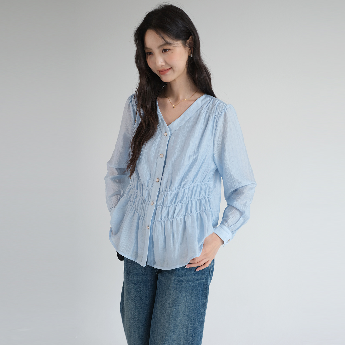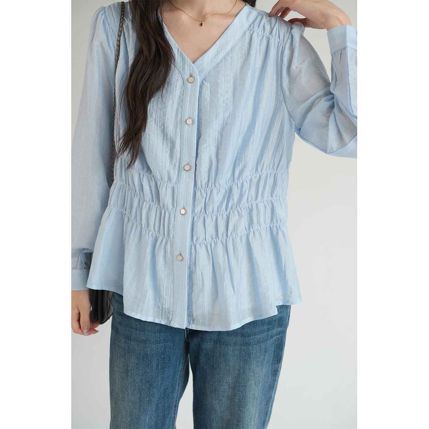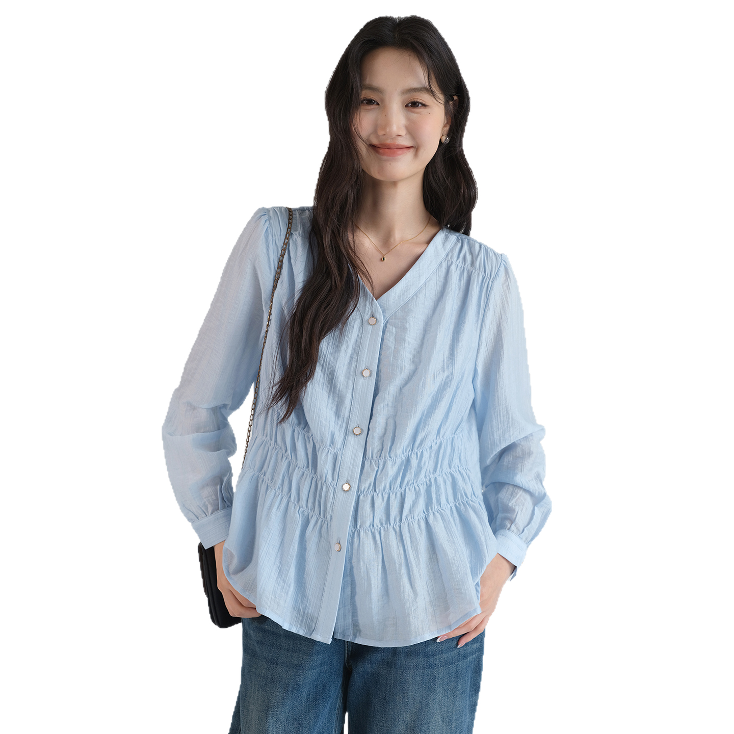 【莱赛尔气质V领衬衫】蓝若水大码2025秋装新款别致褶皱收腰上衣