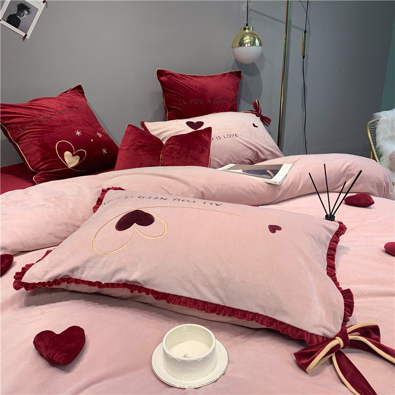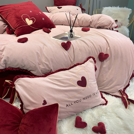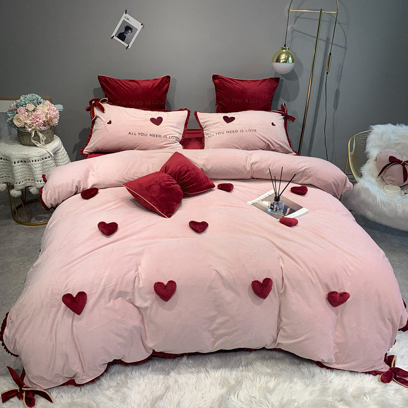 立体毛绒爱心四件套冬季珊瑚绒酒红色加厚牛奶绒韩式风刺绣双面绒