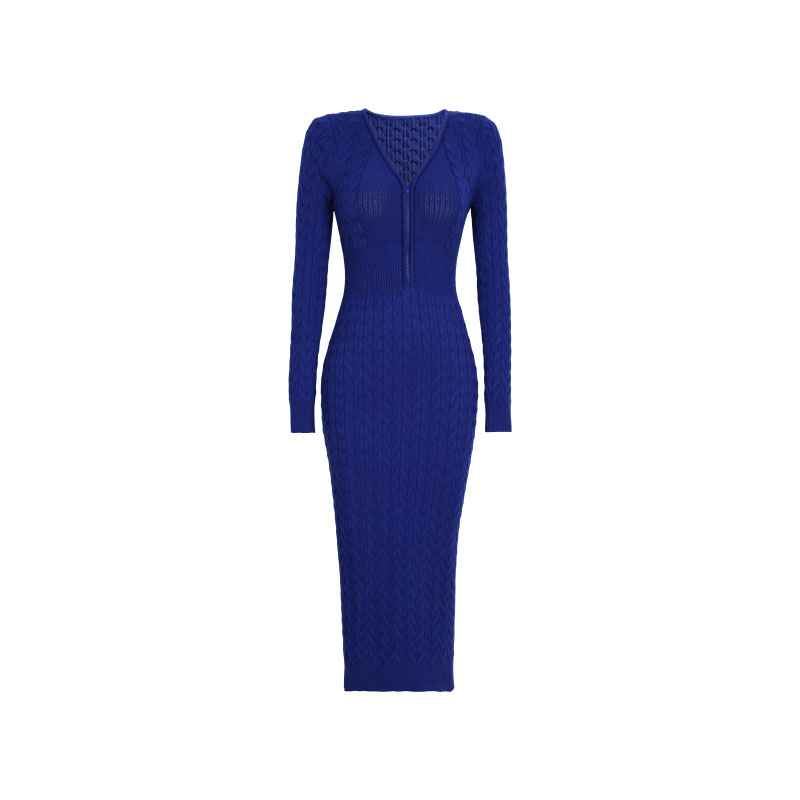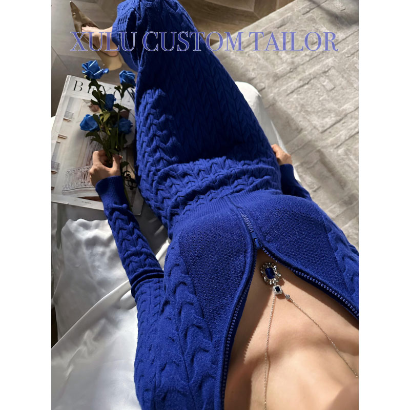 XULU原创秋季气质罗纹拼接羊兔混纺包臀裙纯色针织长袖V领连衣裙