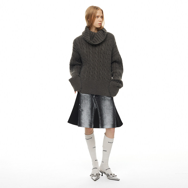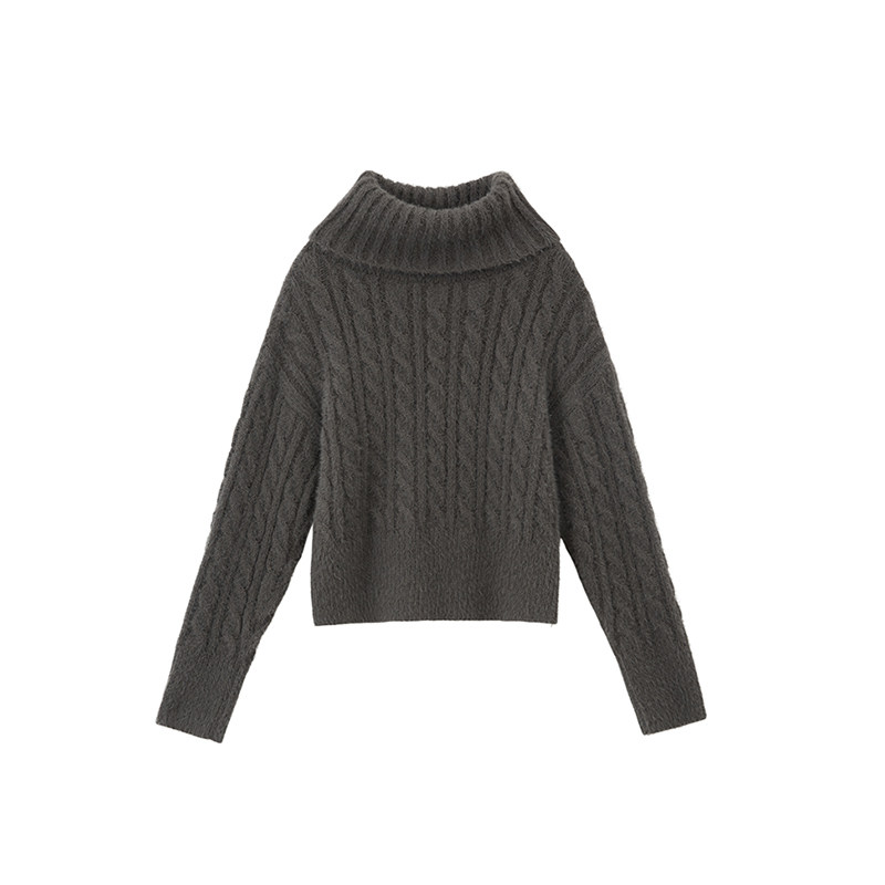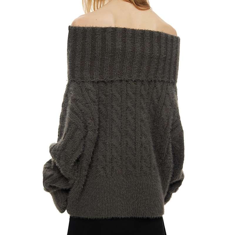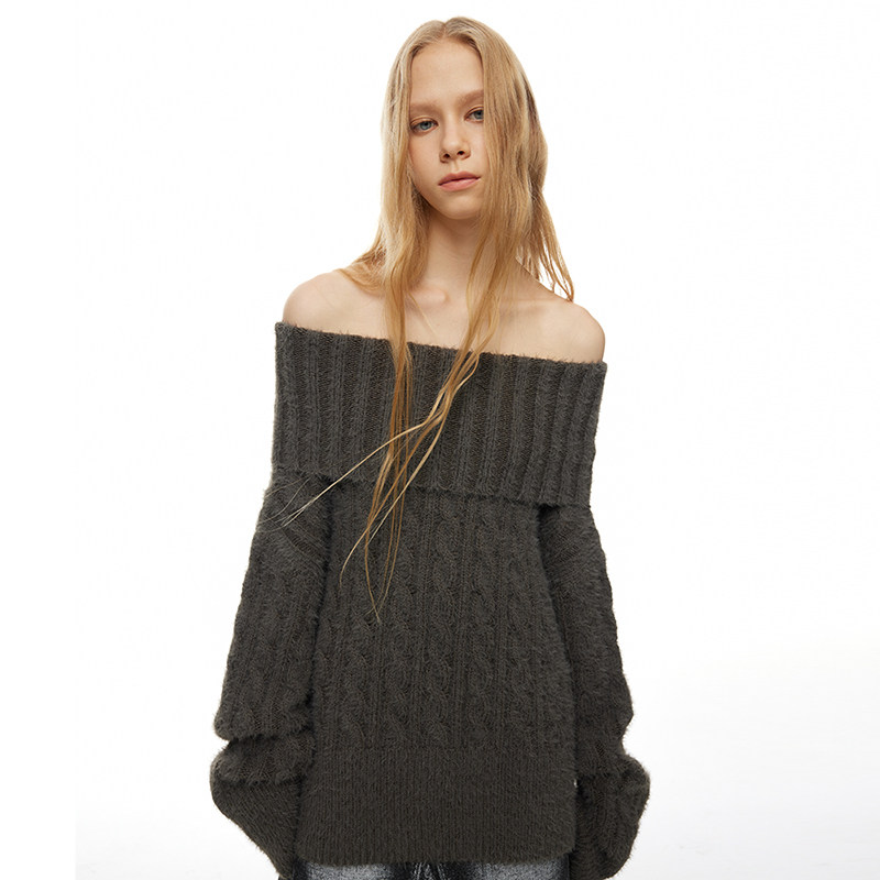 SMIIILE软糯一字肩灰色高领毛衣女冬慵懒风宽松羊毛针织斜肩上衣