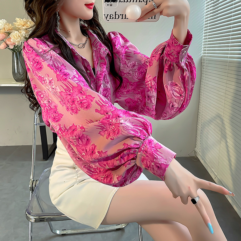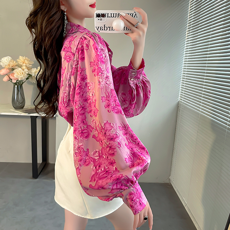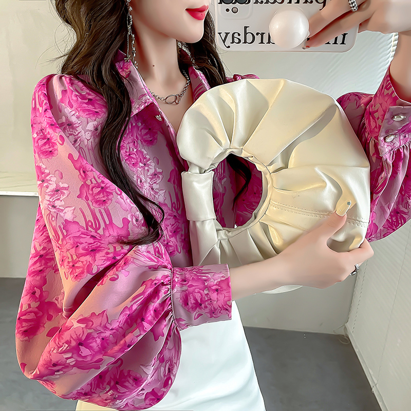 宽松微胖小衫女款花衬衣2023新款女复古碎花上衣灯笼袖气质雪纺衫