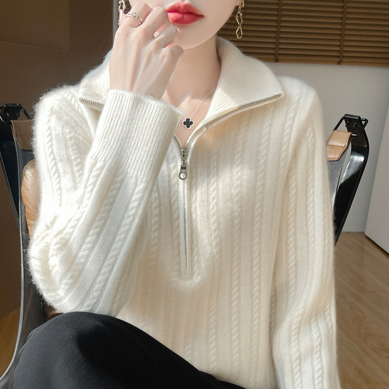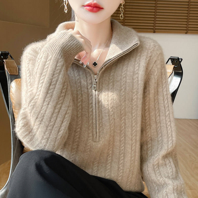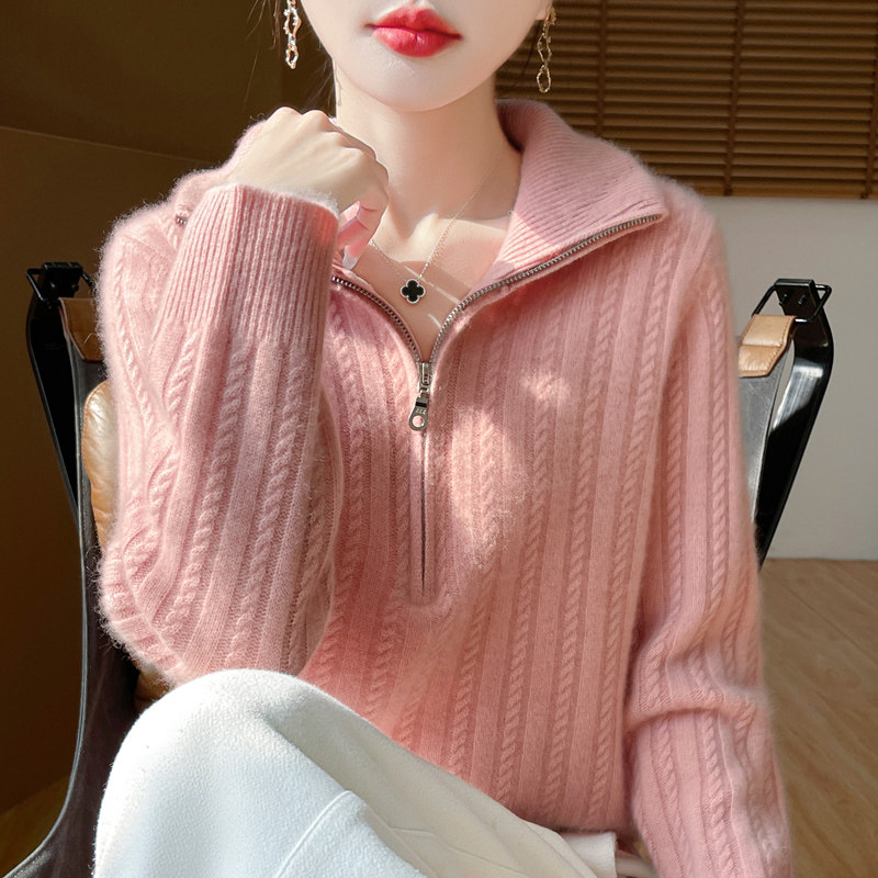 鄂尔多斯市立领羊绒衫女半拉链毛衣加厚麻花时尚洋气针织打底衫