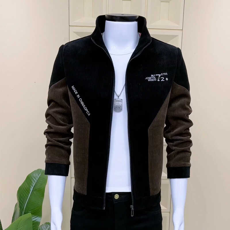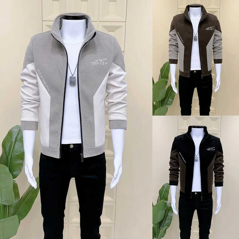 男士夹克春秋新款韩版修身拼色灯芯绒外套男立领网红休闲帅气上衣
