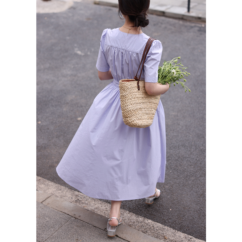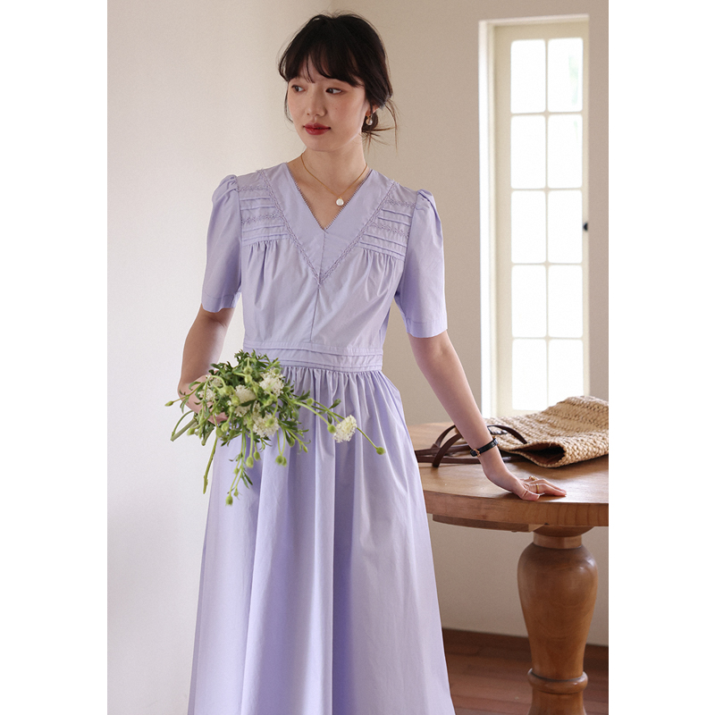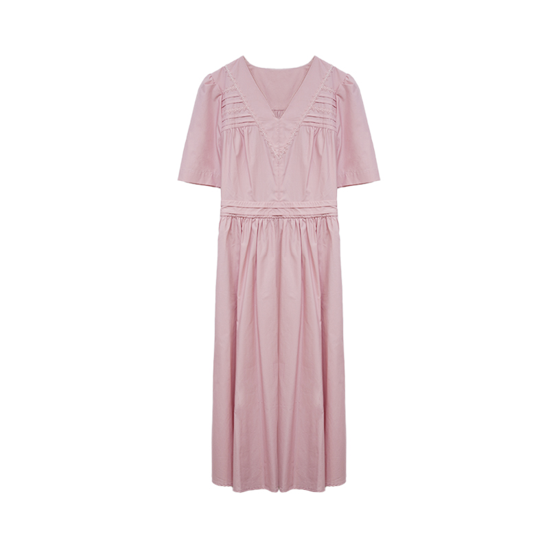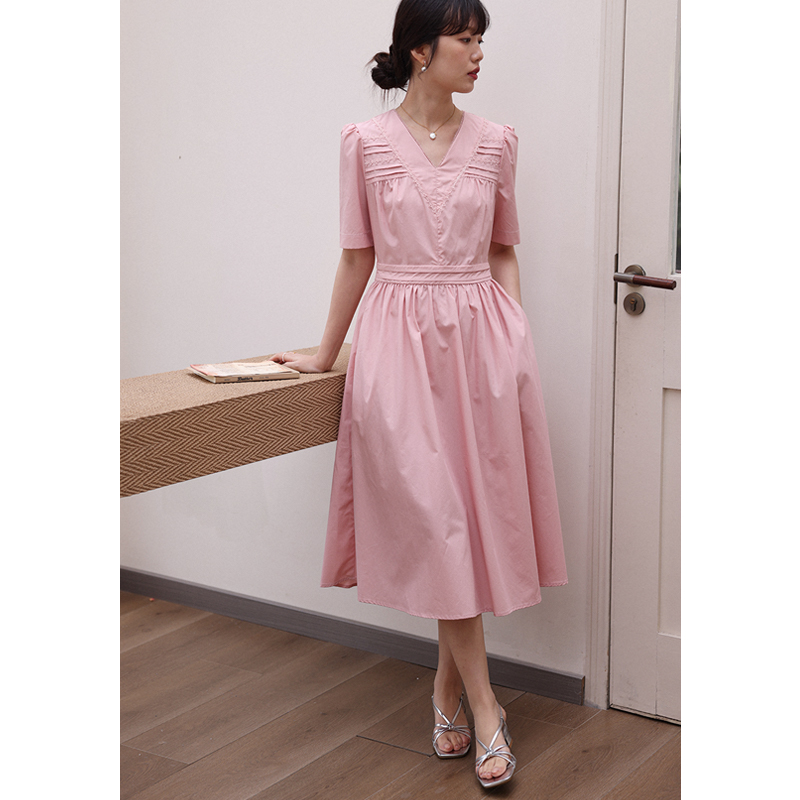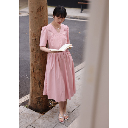 无拘2025年春夏新款常规短袖收腰中长裙小众设计感v领收腰连衣裙