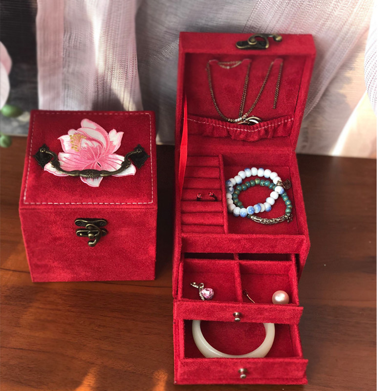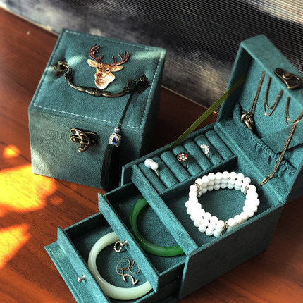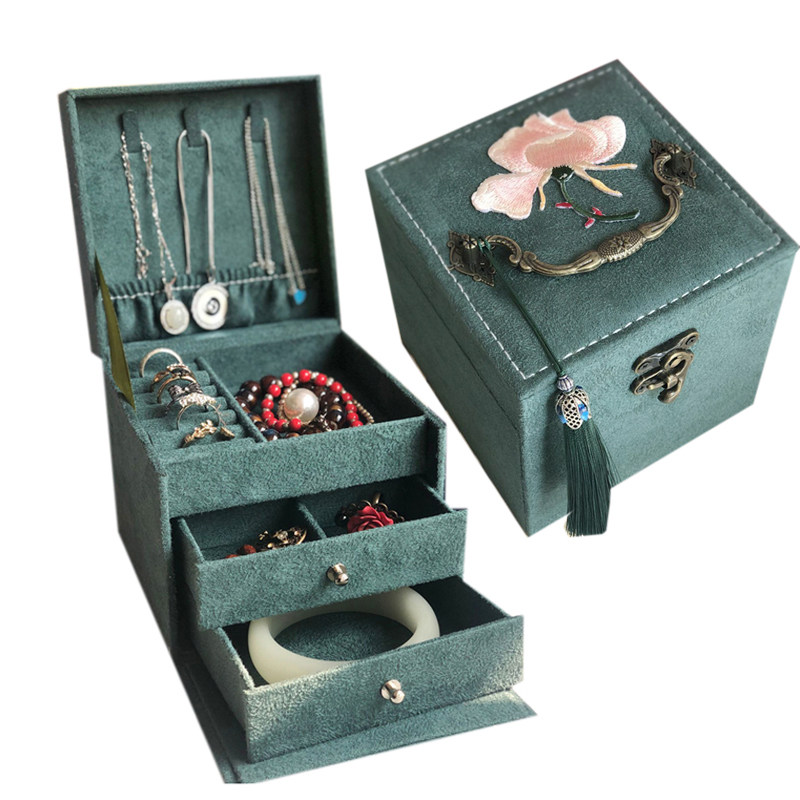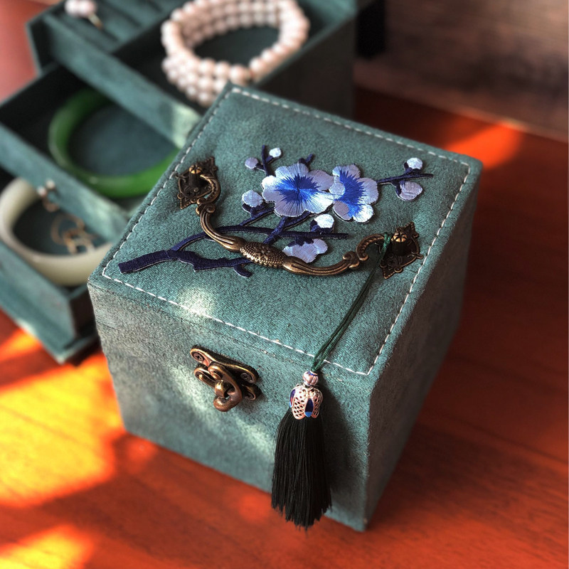 墨绿复古首饰盒小号梅花手提饰品盒中国风首饰收纳盒生日礼品流苏