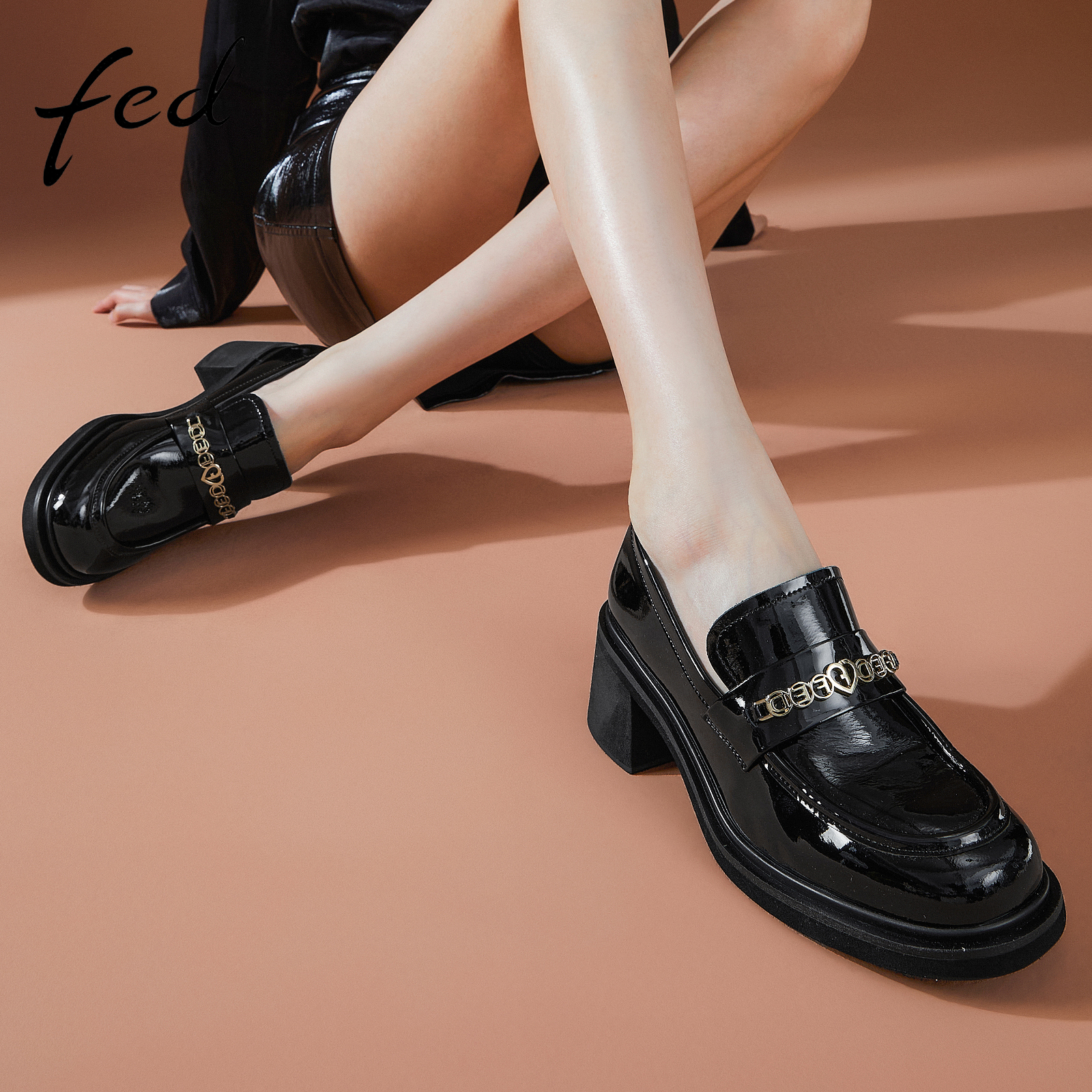 fed黑色乐福鞋女冬季新款女鞋粗跟小皮鞋深口单鞋女款D0923-YA325