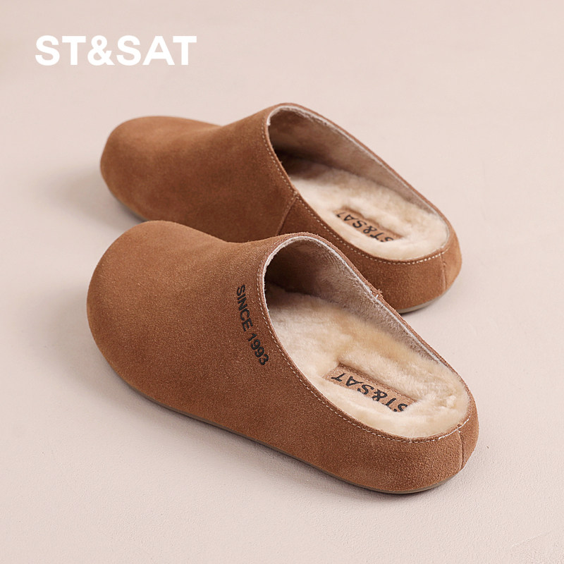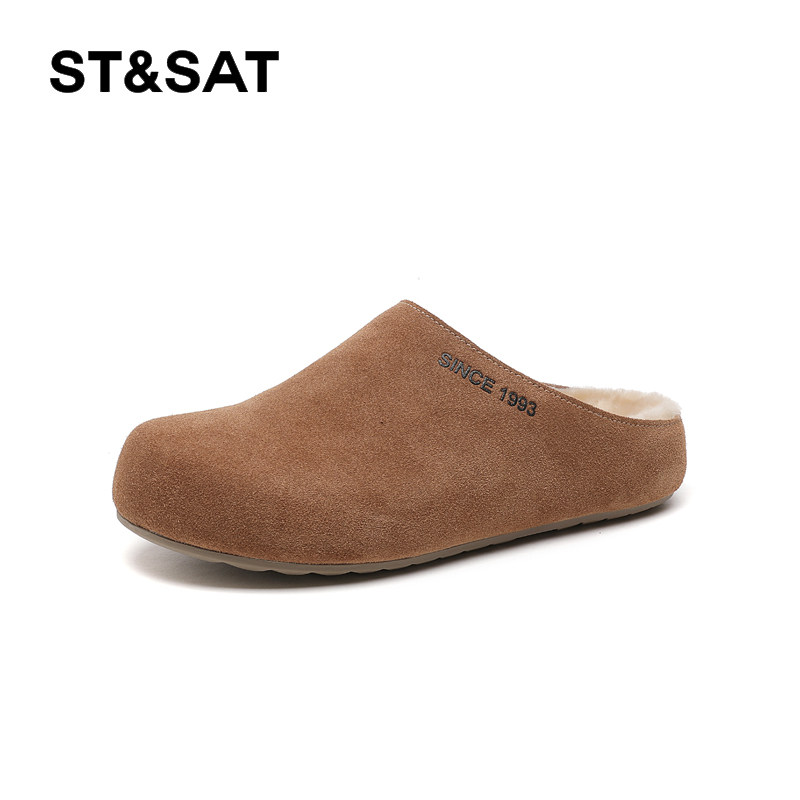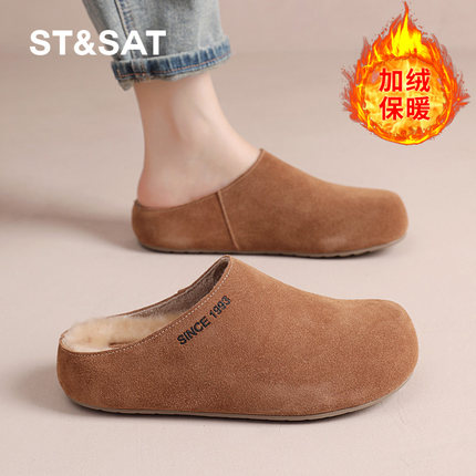 星期六官方正品女鞋2024冬季新款加绒牛皮勃肯鞋3.5CM半包懒人鞋