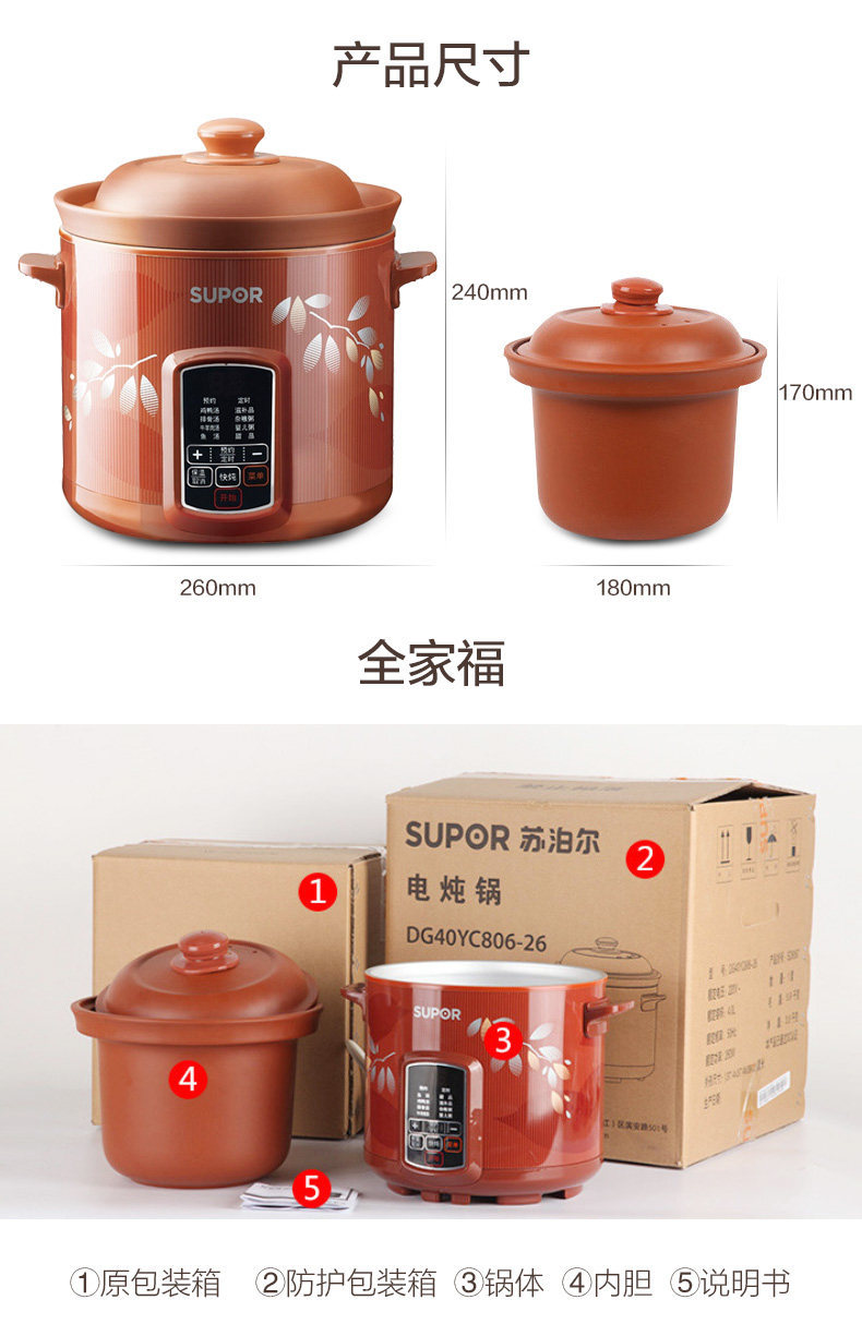 苏泊尔DNZ40B6-260/DG40YC806-26紫砂陶瓷电炖锅4L升原装内胆盖子