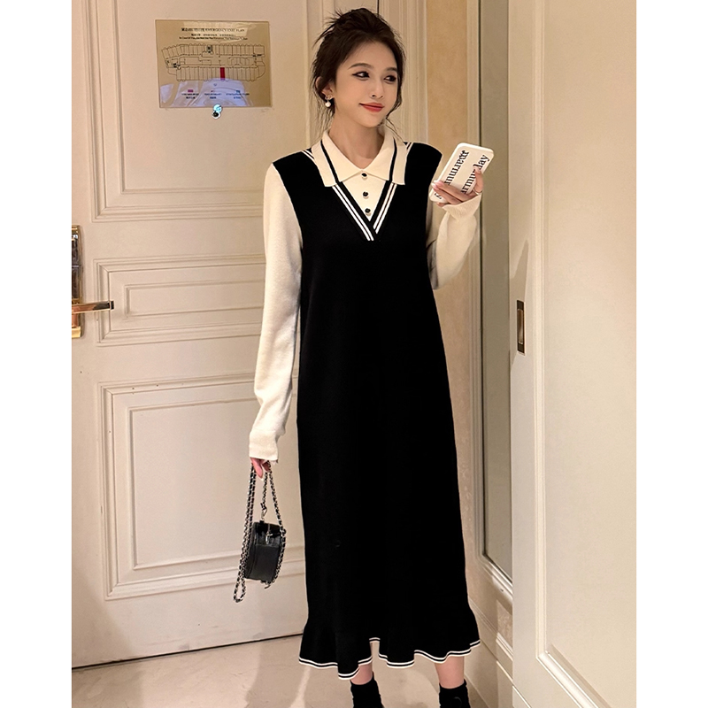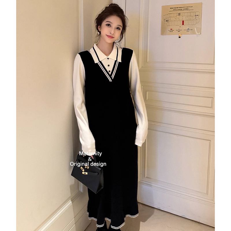 孕妇连衣裙秋冬2025新款孕妈polo领黑色洋气荷叶边针织裙中长款女