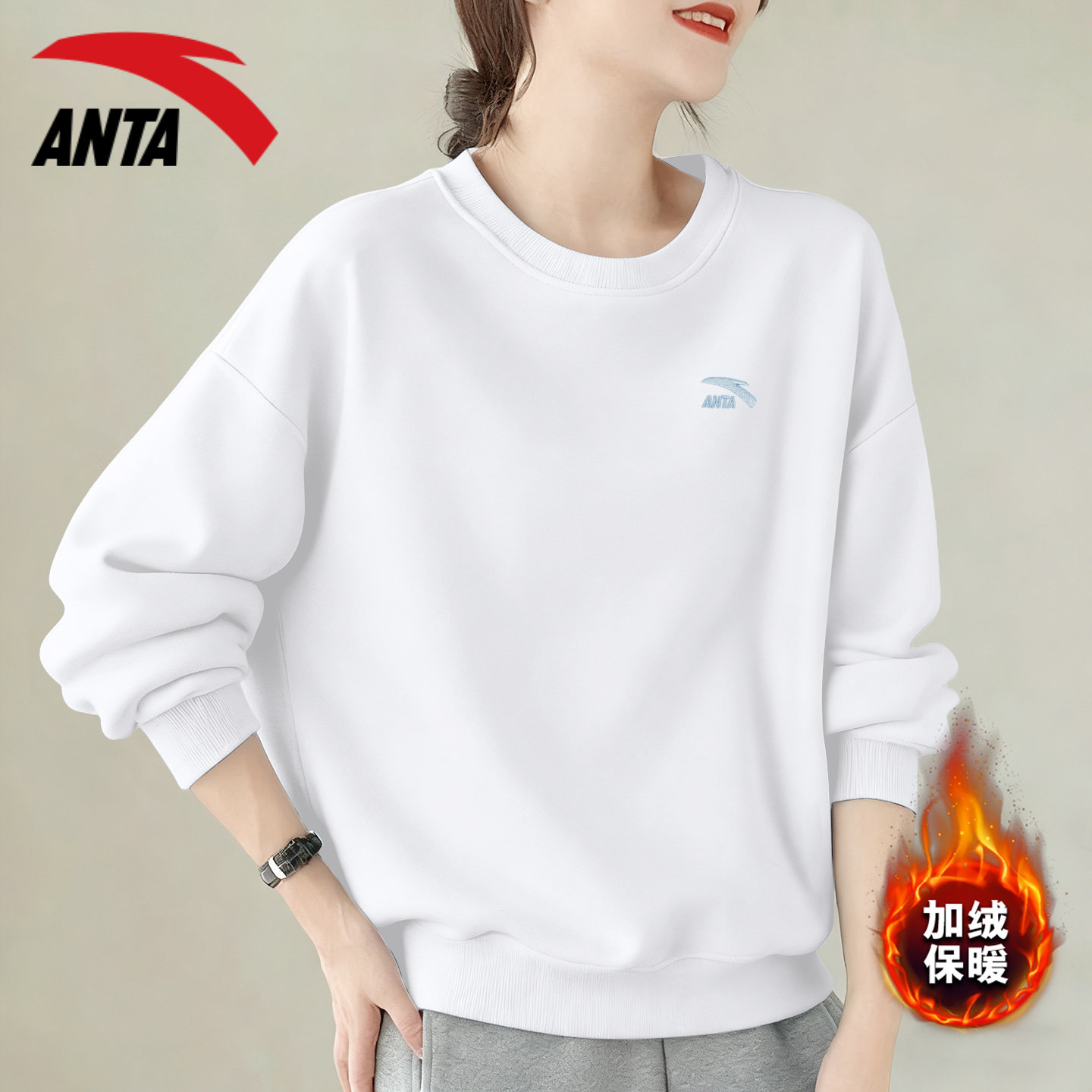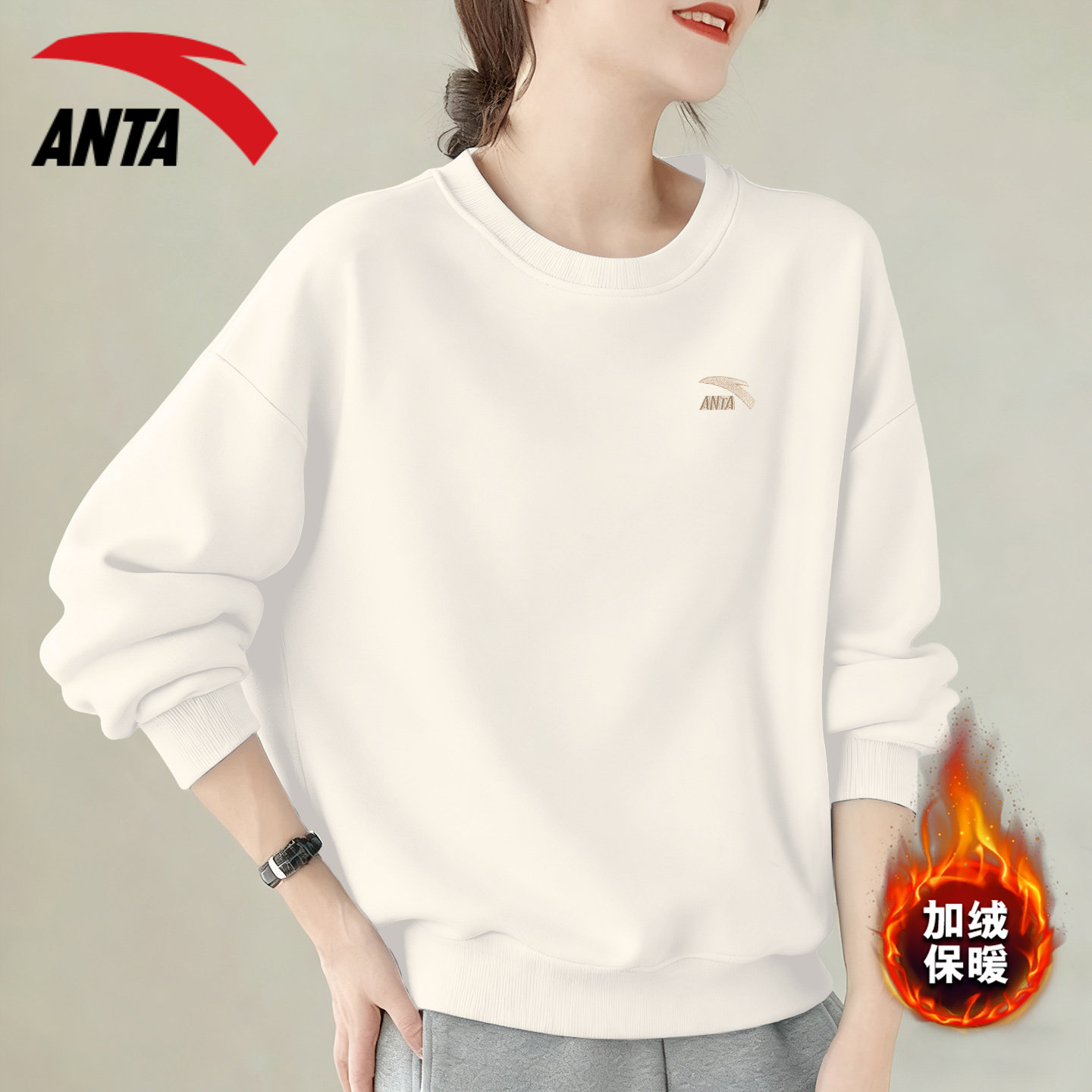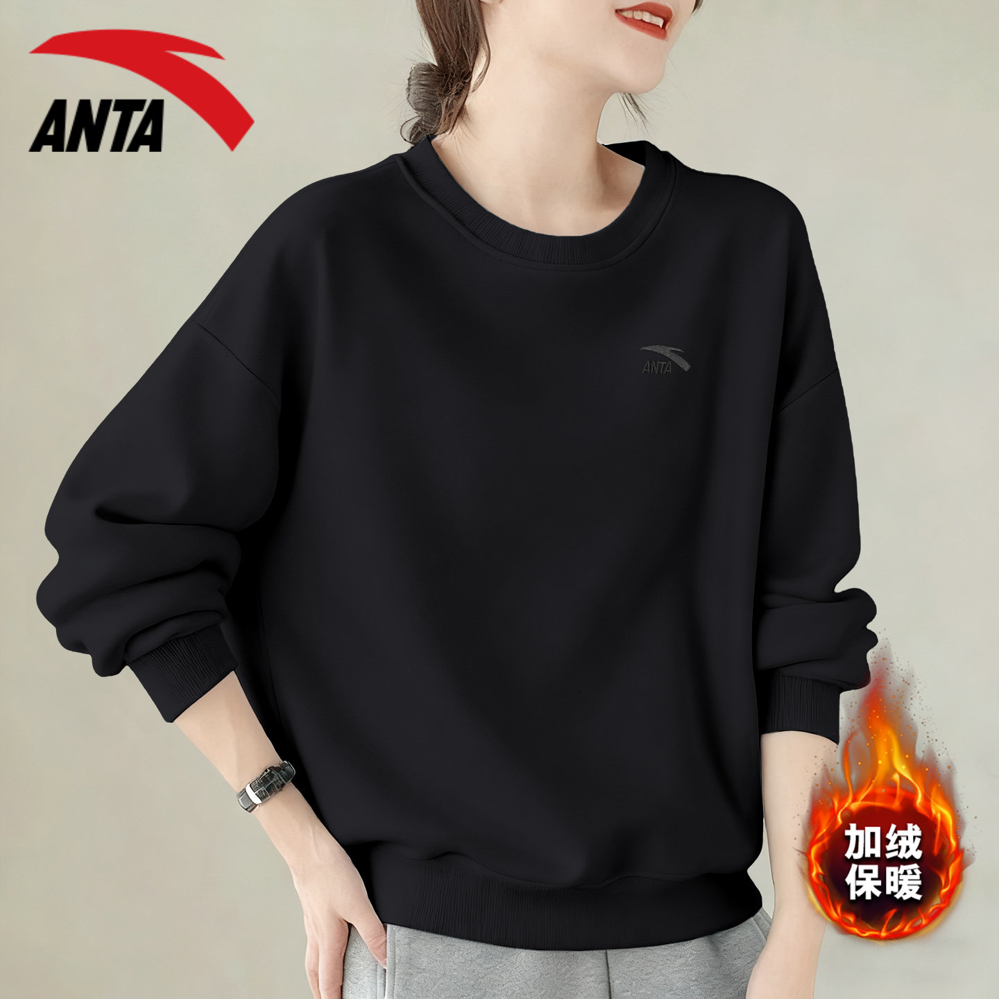 安踏酒红色加绒卫衣女冬季新款加厚保暖纯色百搭长袖休闲运动服女