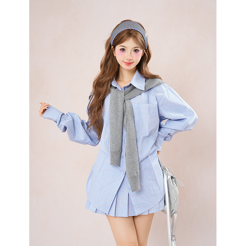 菲尔顿学院 韩系蓝色格子衬衫半裙套装女秋季设计感学院风两件套