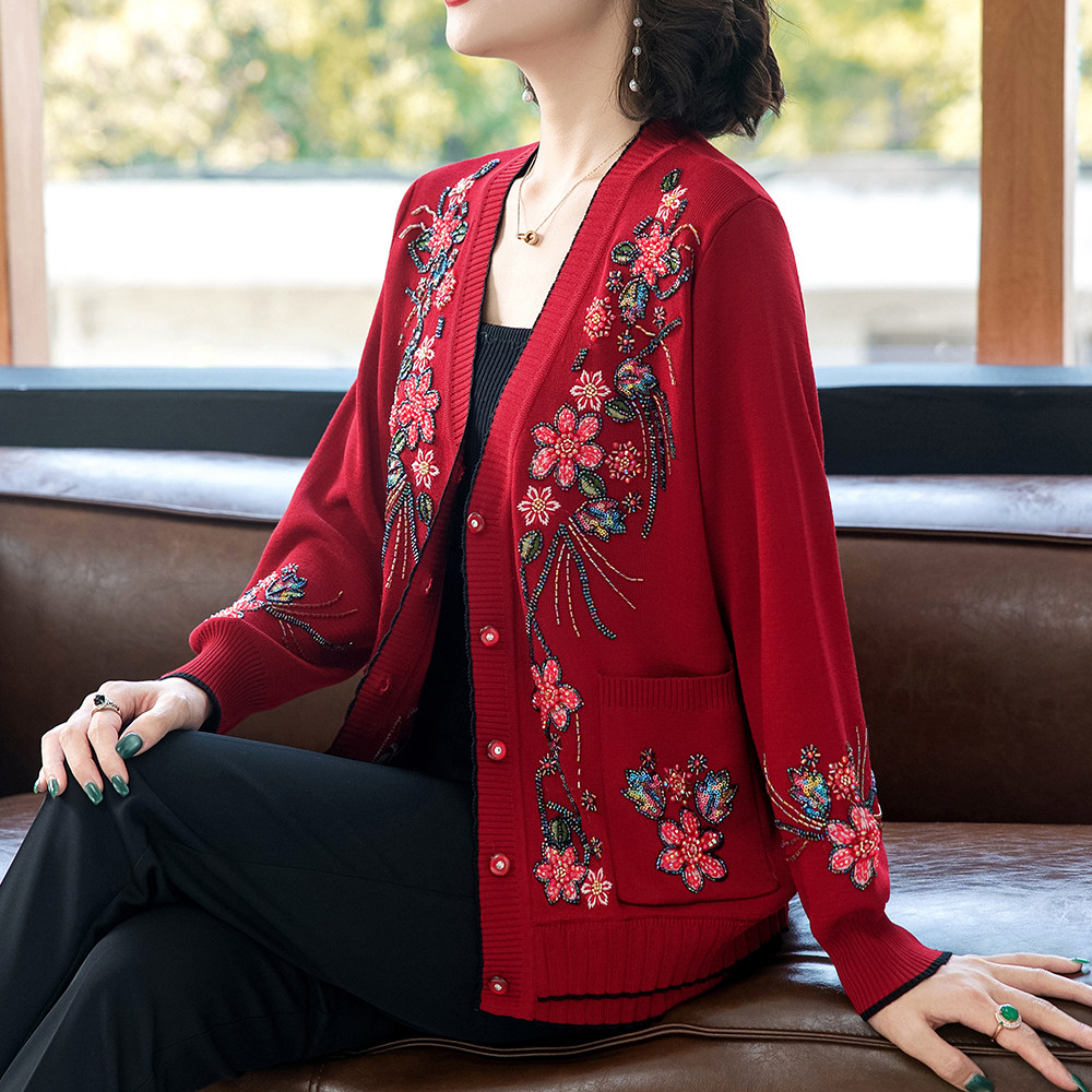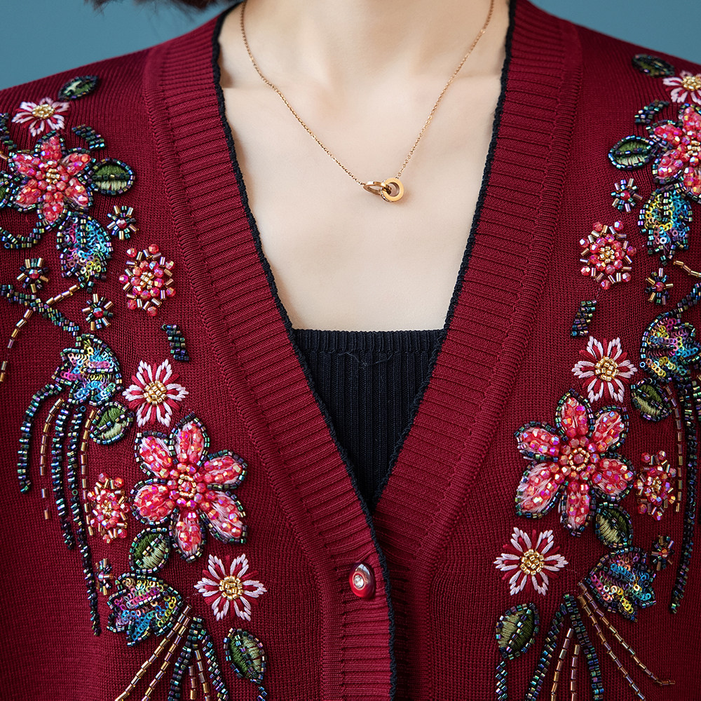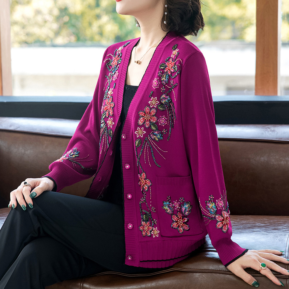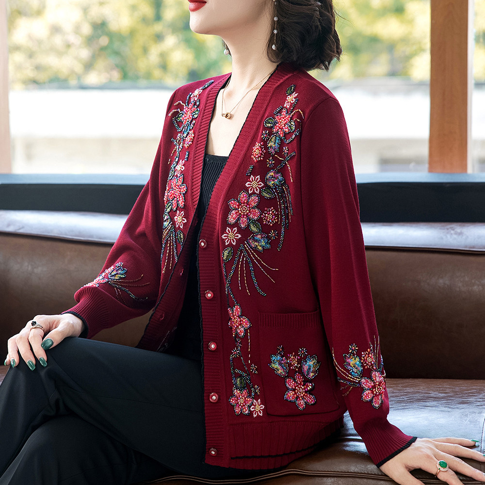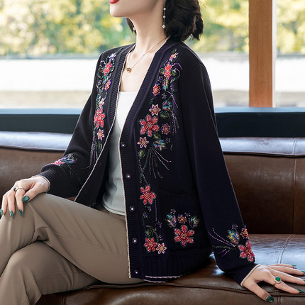 刺绣重工妈妈外套洋气中老年女秋装衣服老人春秋针织开衫老年上衣