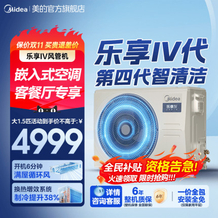 美的风管机大1.5匹变频客厅空调一拖一中央空调乐享四代一级能效