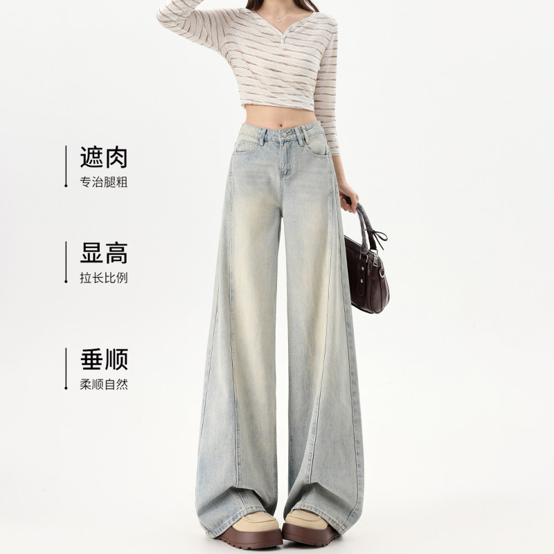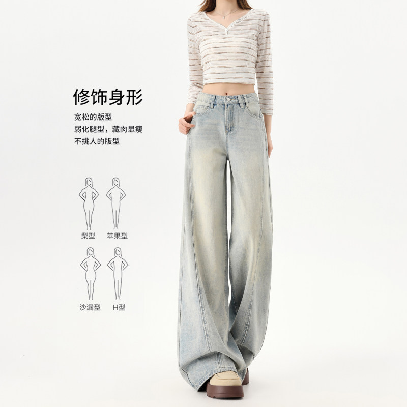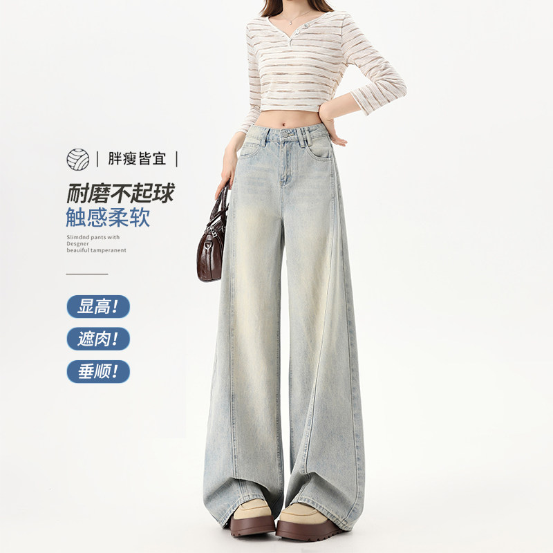 拉夏贝尔浅蓝色高街弯刀牛仔裤女春秋新款高腰宽松显瘦阔腿直筒裤
