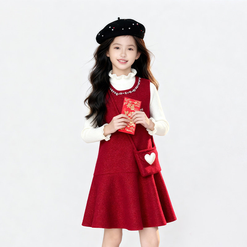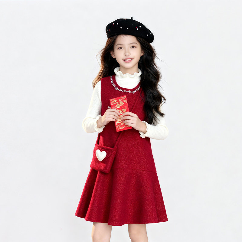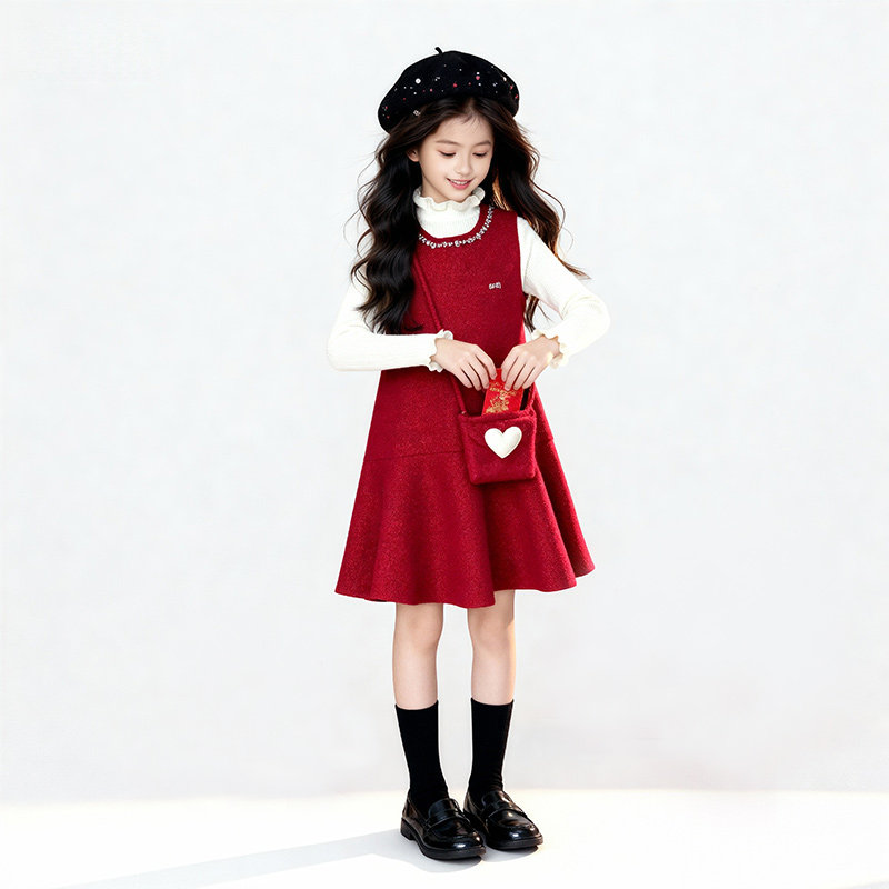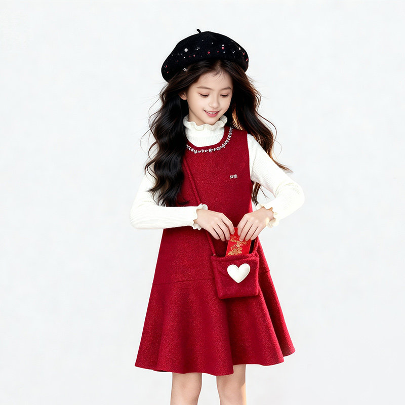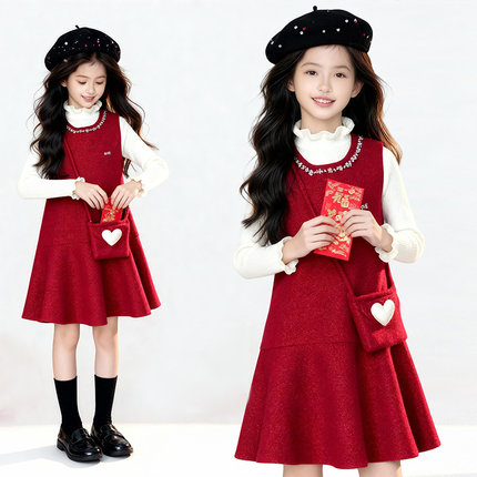 女童连衣裙秋冬季2025年新款时尚红色新年喜庆打底衣裙子两件套潮