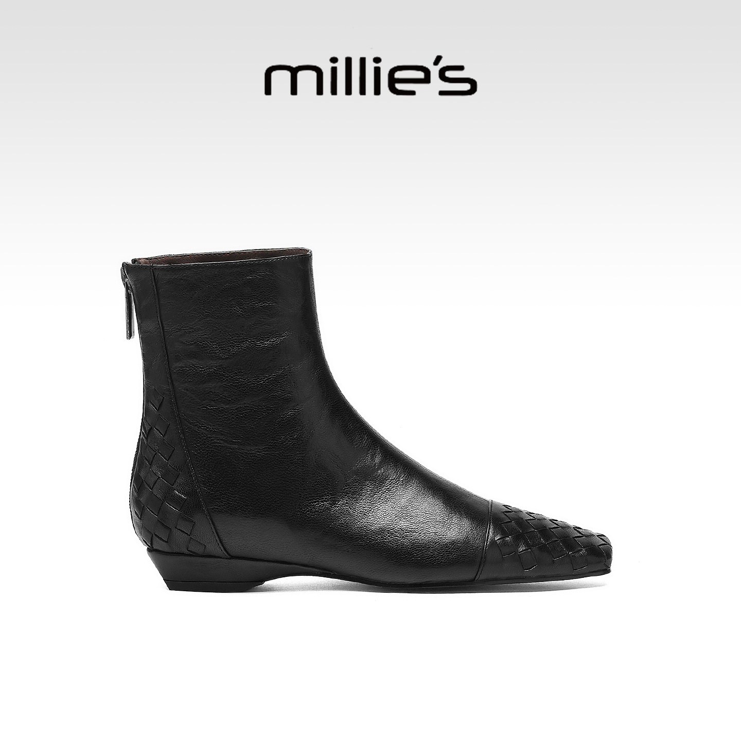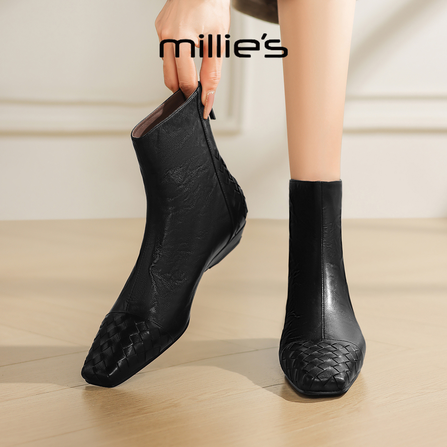 MILLIE'S/妙丽真皮编织短靴女2025新款秋冬加绒粗跟方头瘦瘦靴