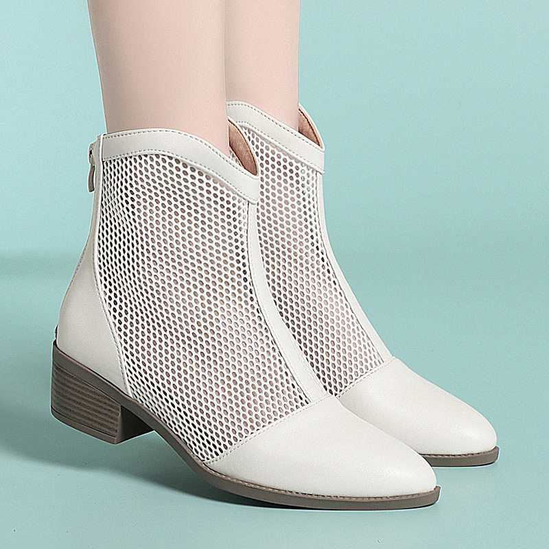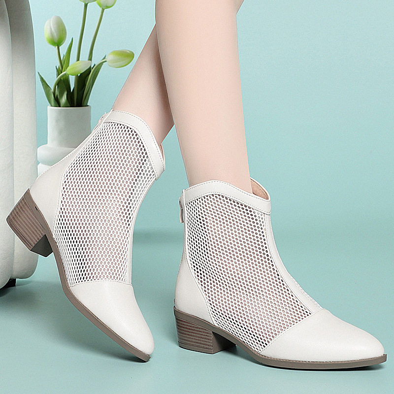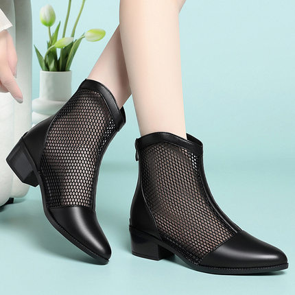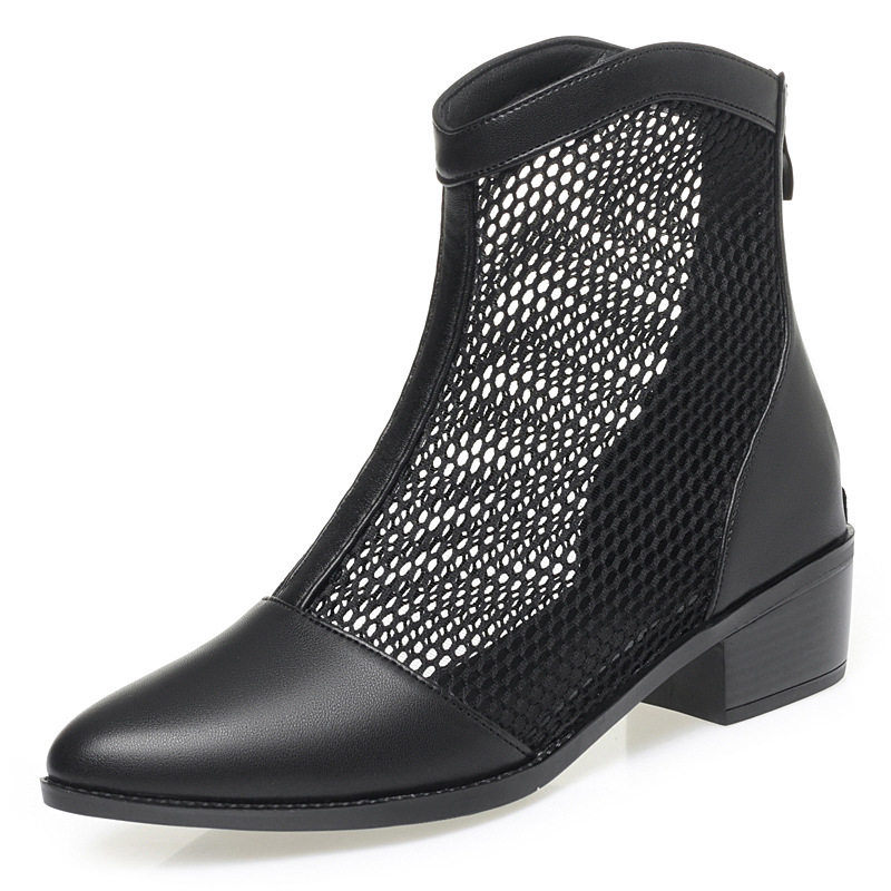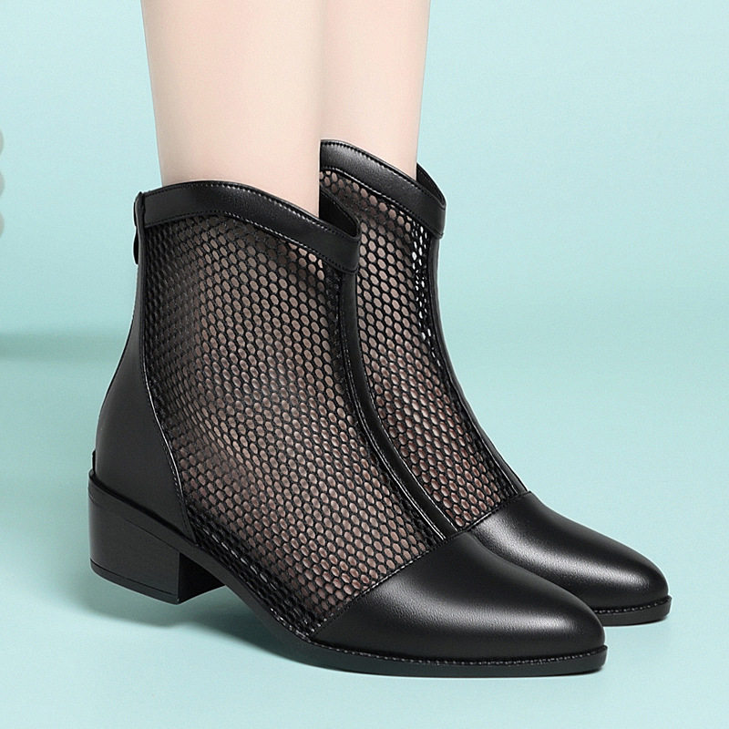 23年春季新款粗跟休闲凉鞋牛皮英伦现货大码女鞋蕾丝网靴
