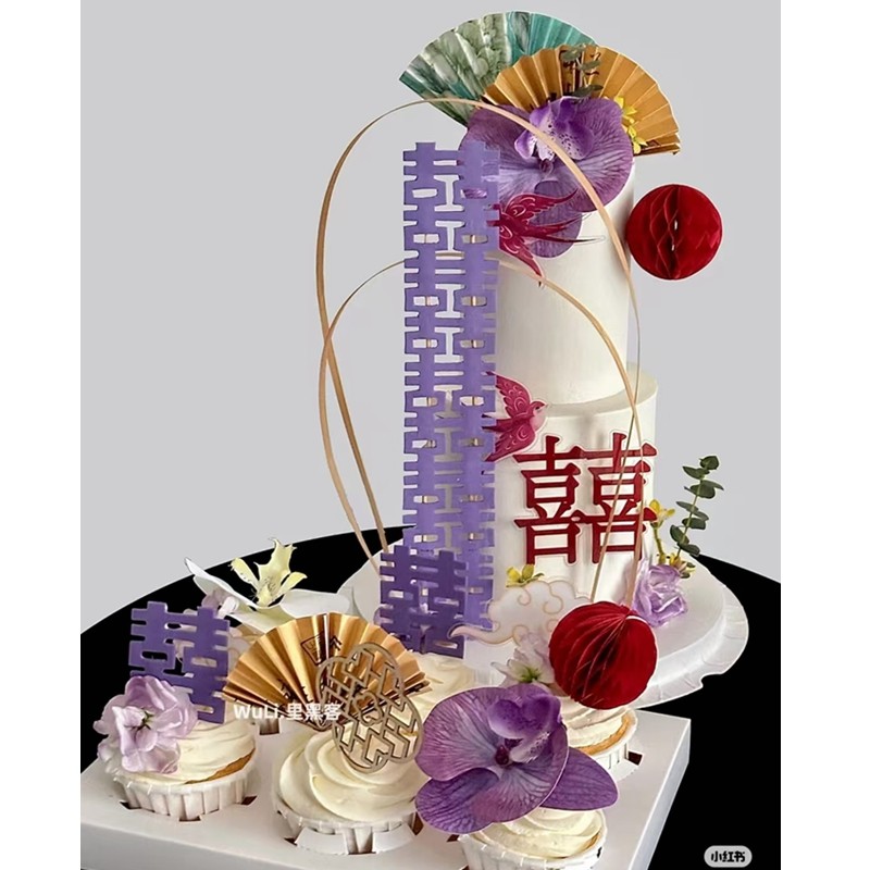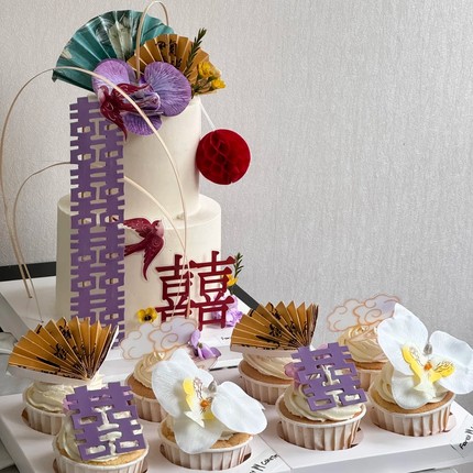 新中式订婚蛋糕装饰纸杯子甜品台紫色系蝴蝶兰红双喜古风扇子插件