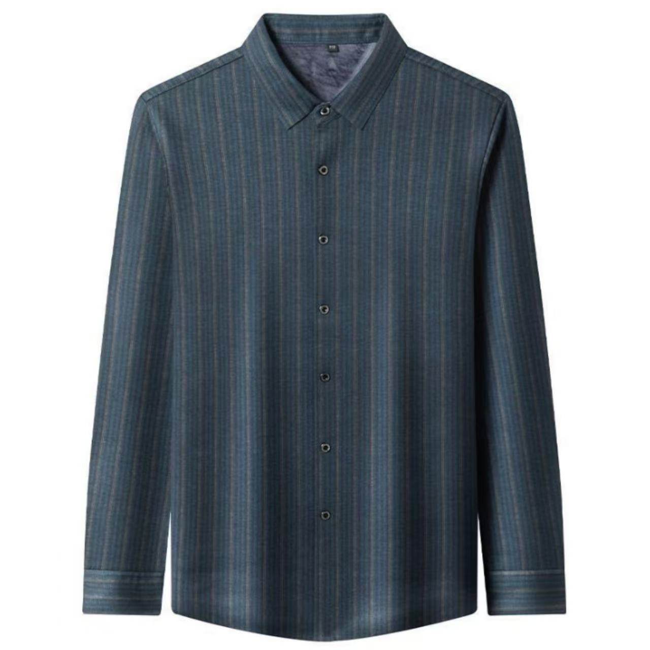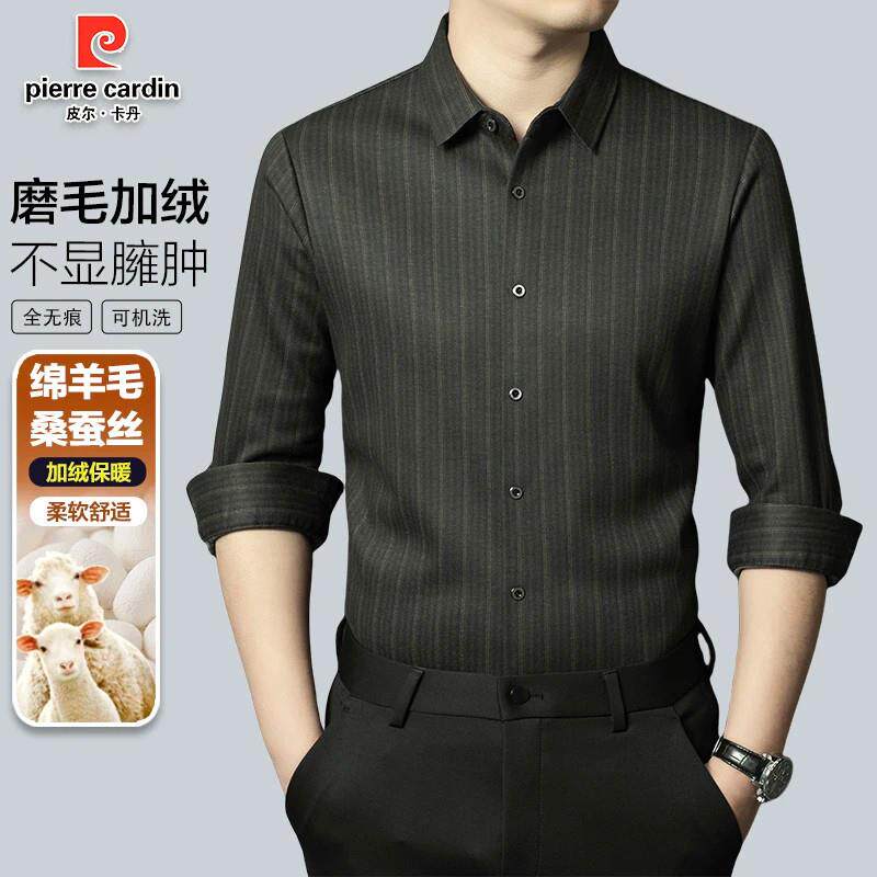 皮尔卡丹绵羊毛桑蚕丝男士加绒保暖衬衫舒适商务休闲条纹长袖衬衣