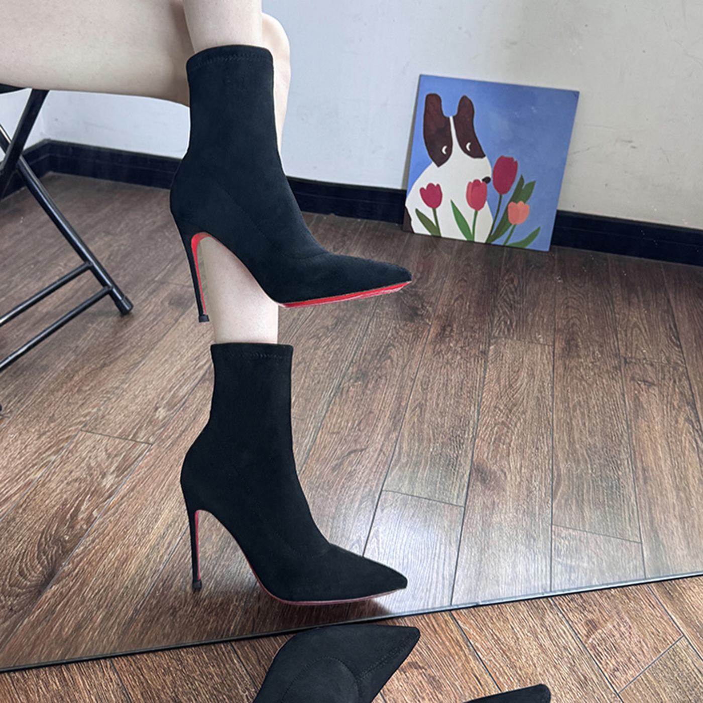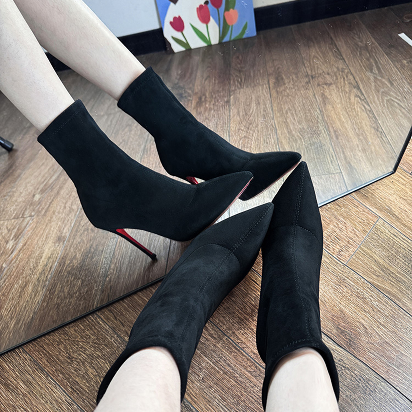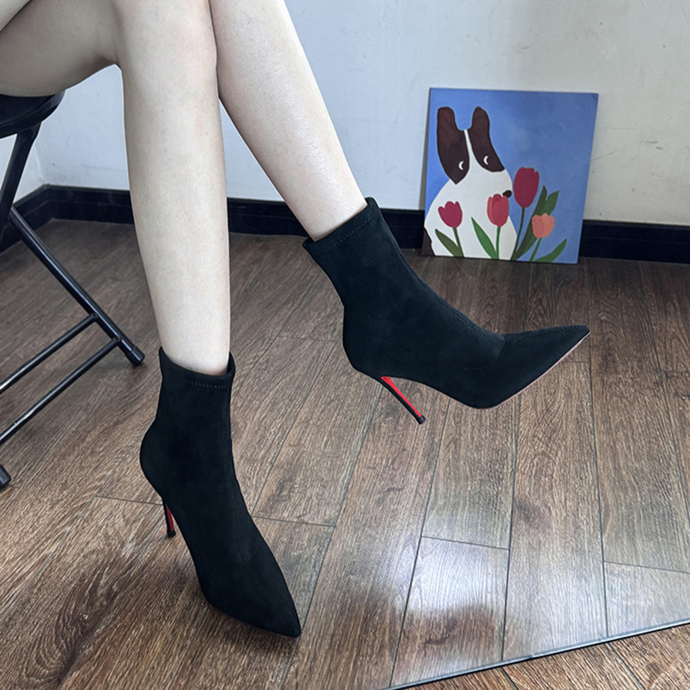 黑色短靴女秋冬季2025新款细跟尖头瘦瘦靴性感御姐红底高跟鞋靴子