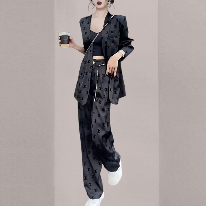 夏季黑色缎面印花西装外套女宽松休闲西裤高腰阔腿裤套装时尚炸街