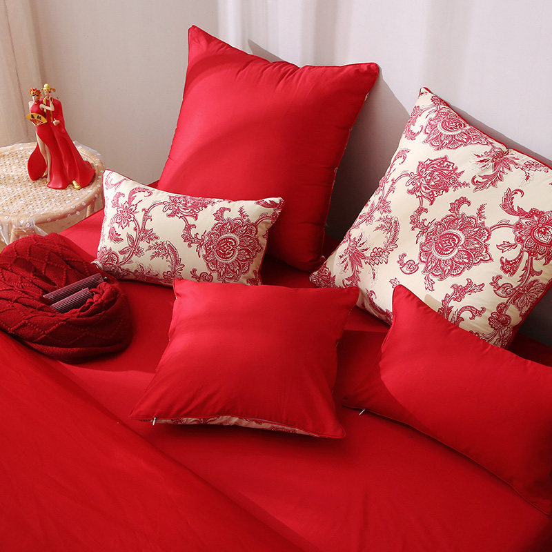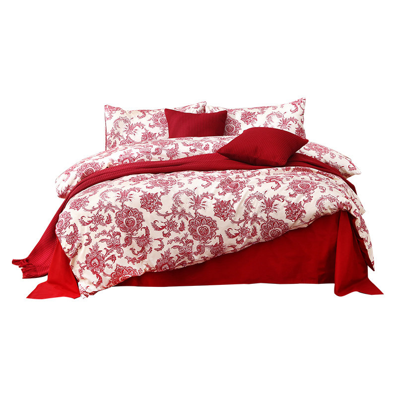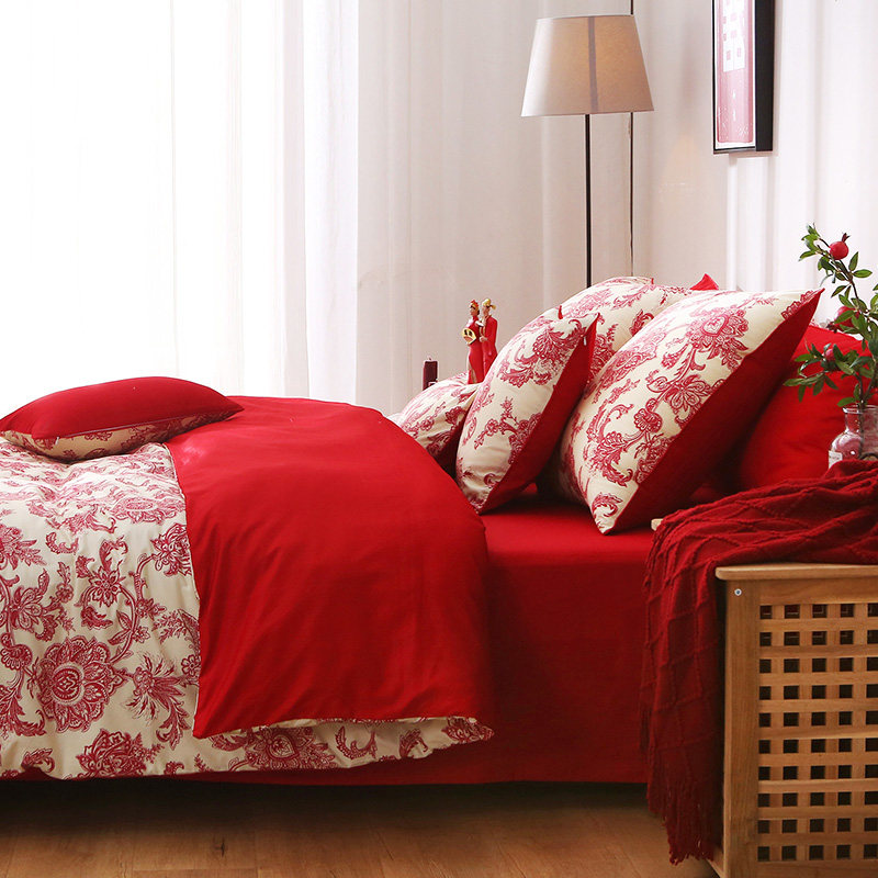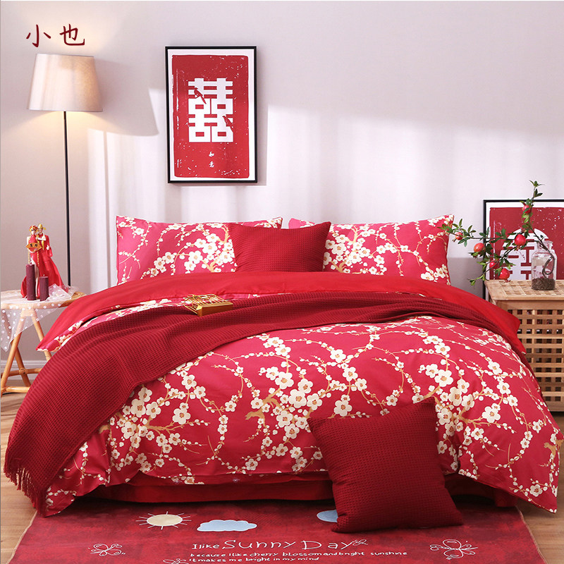 结婚婚庆四件套六件套大r红床单床笠新婚日常纯棉全棉喜被被套被