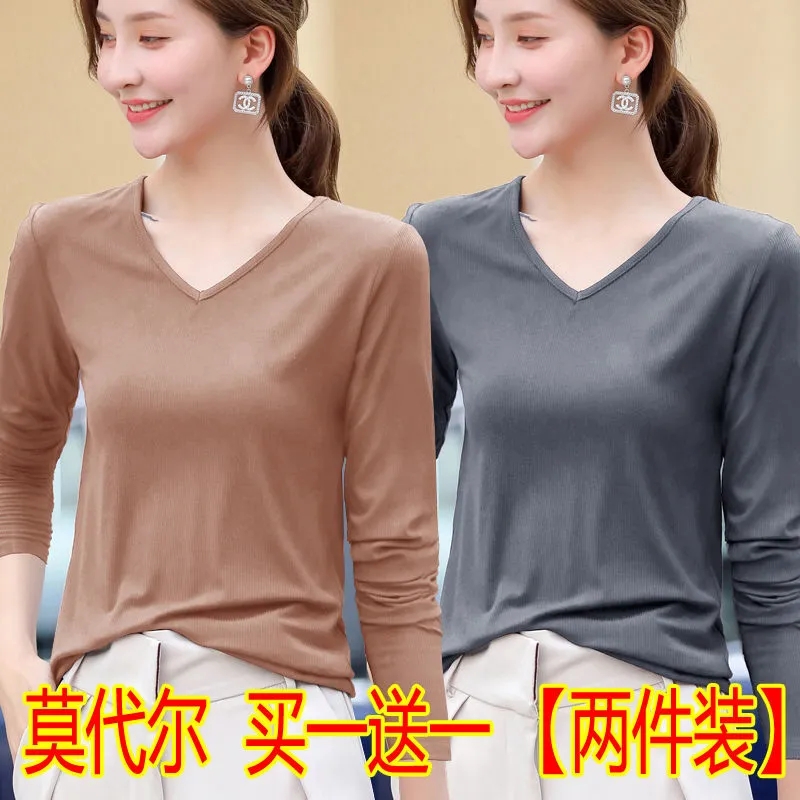 单/两件 莫代尔长袖t恤女春秋新款V领打底衫体恤修身高档内搭上衣