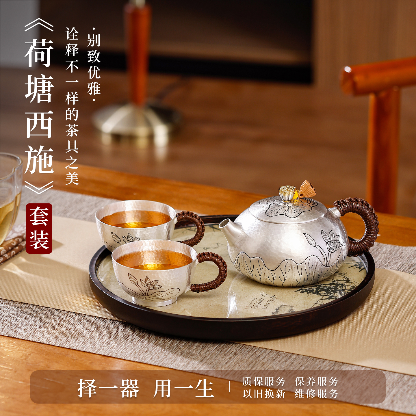 复古银壶纯银999泡茶壶手工一张打扁西施壶功夫茶具仿生荷花茶壶