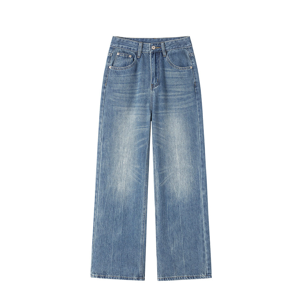 春季新款树皮皱阔腿牛仔裤肌理感刺绣高腰宽松显瘦直筒拖地裤女