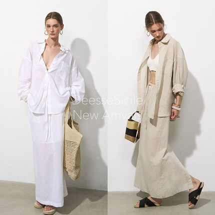 DeesseSicile 白色100%亚麻松弛假日老钱风宽松衬衫半身裙套装女