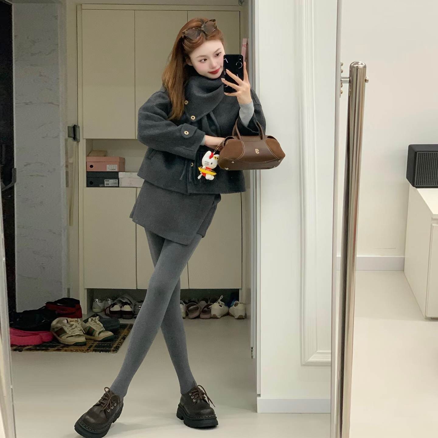 韩系高级感毛呢外套灰色半身裙两件套装女秋冬小个子洋气显贵穿搭