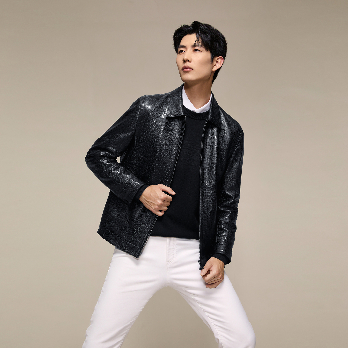 【仿鳄鱼纹】柒牌男装真皮皮衣2025秋季新品防风翻领拉链朋克外套