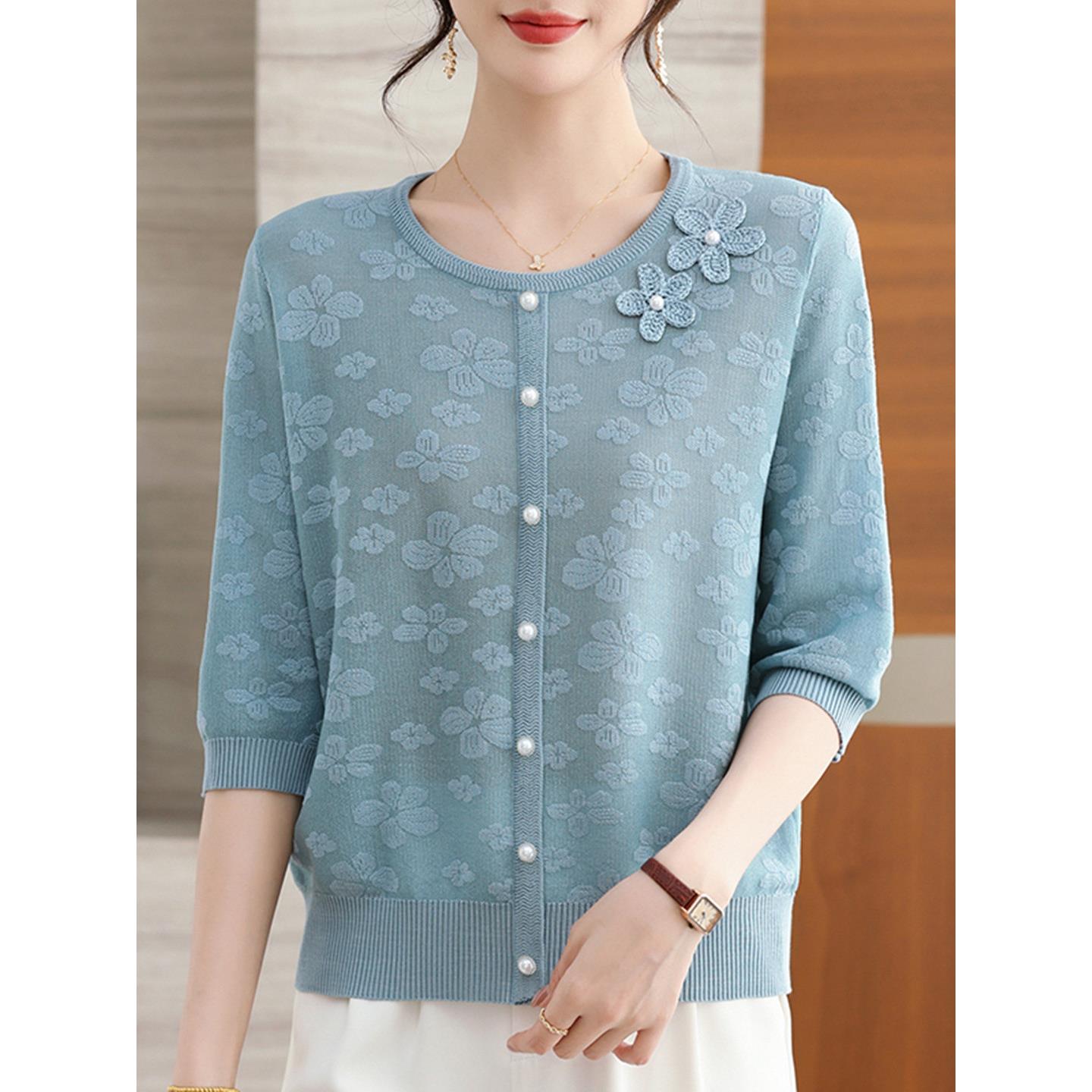中年妈妈薄款桑蚕丝七分袖t恤早秋装新款时尚小香风针织上衣圆领