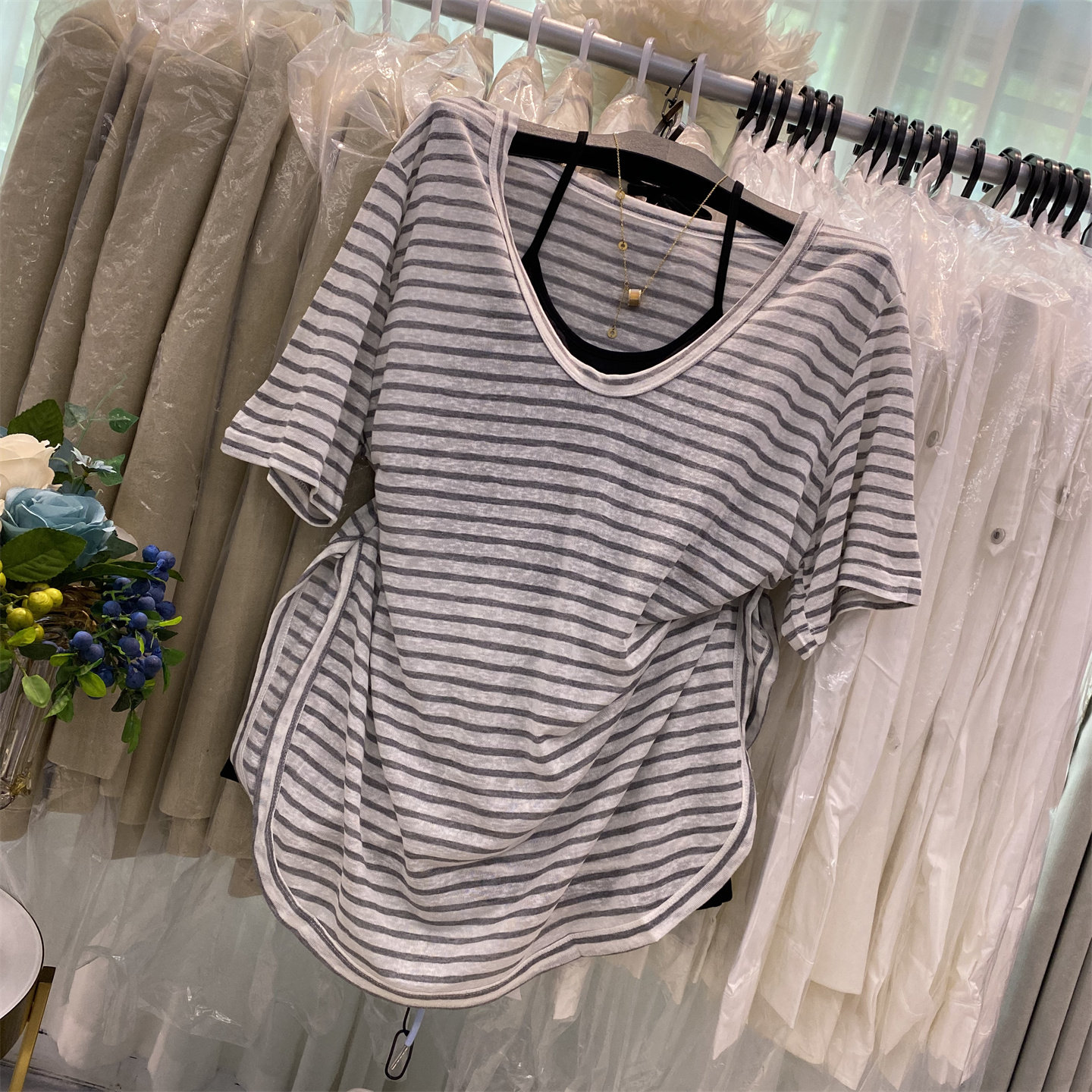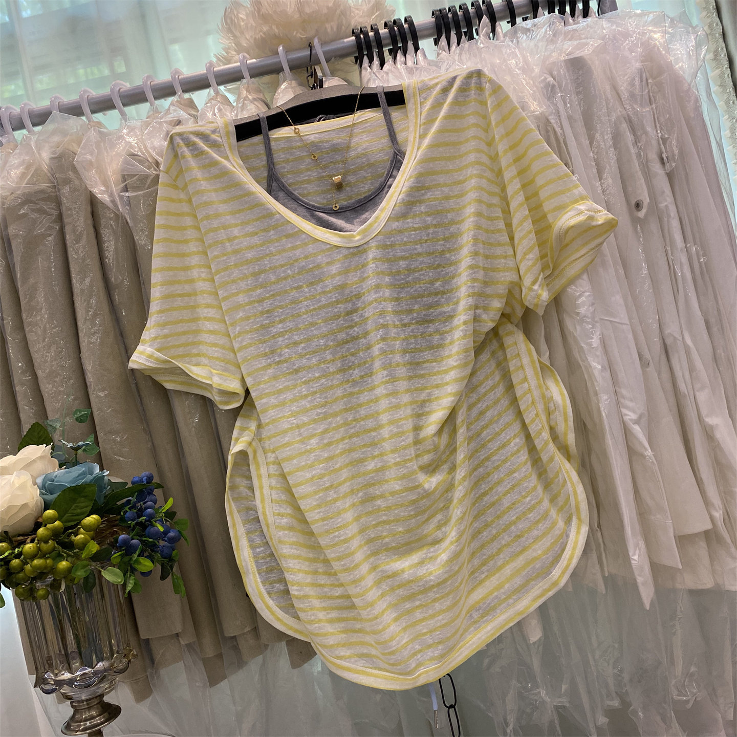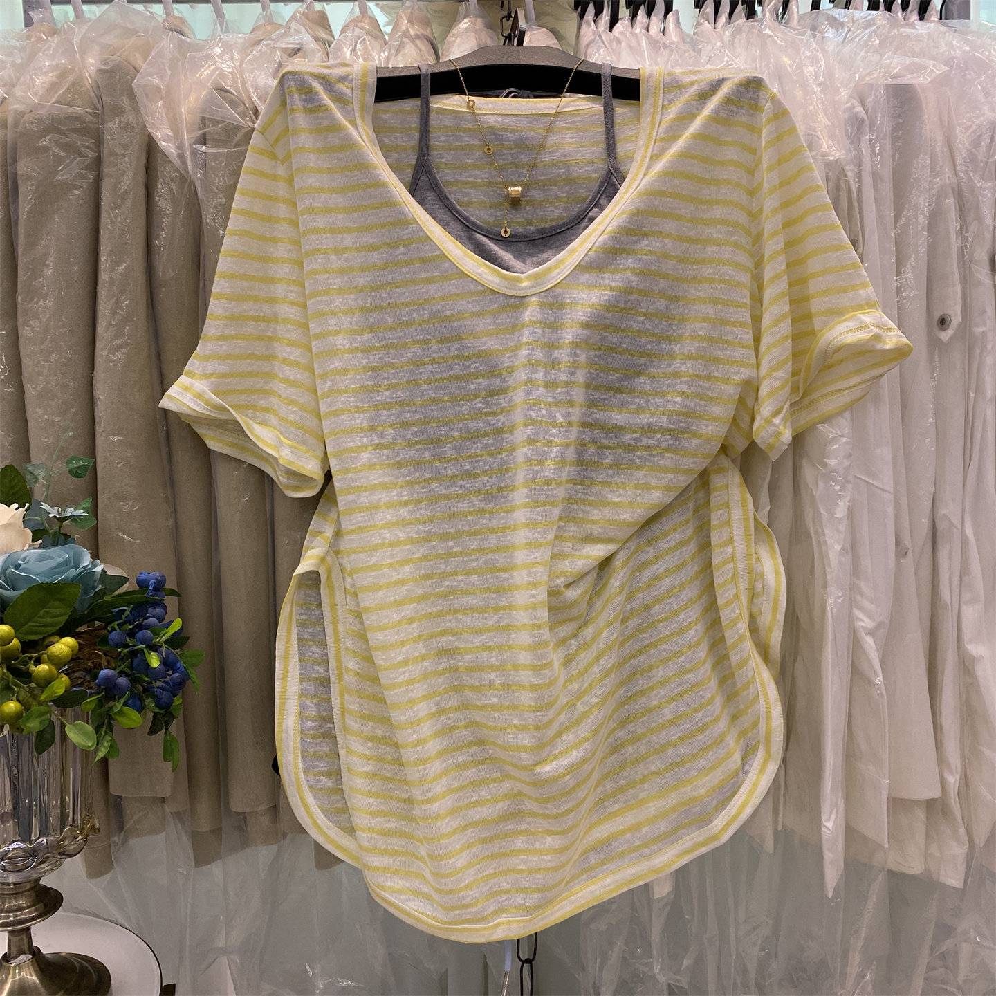 V领宽松薄款条纹罩衫+背心两件套