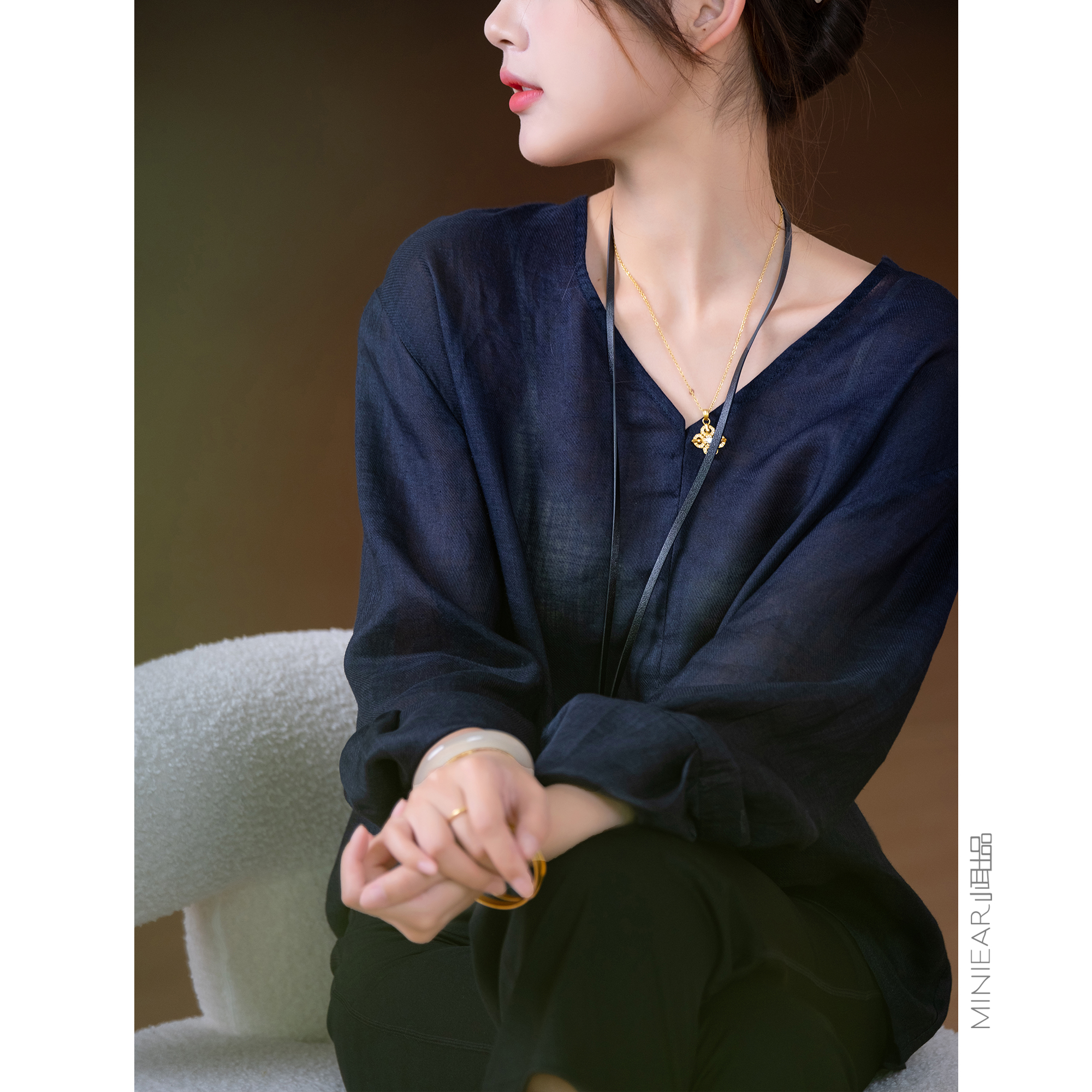 小耳出品 穿堂风~细支100%苎麻/内包缝工艺 轻薄V领宽松显瘦长袖T
