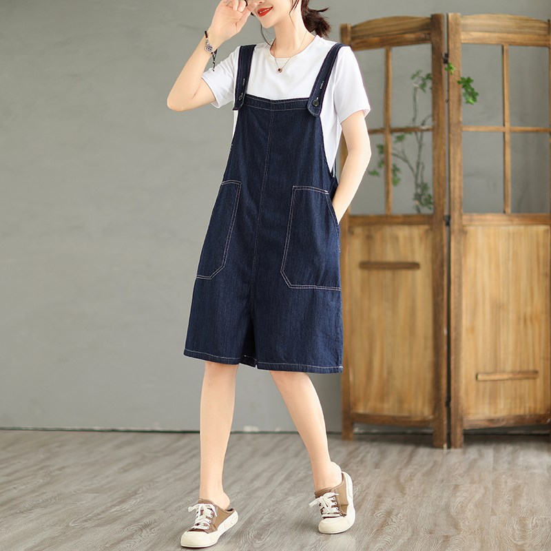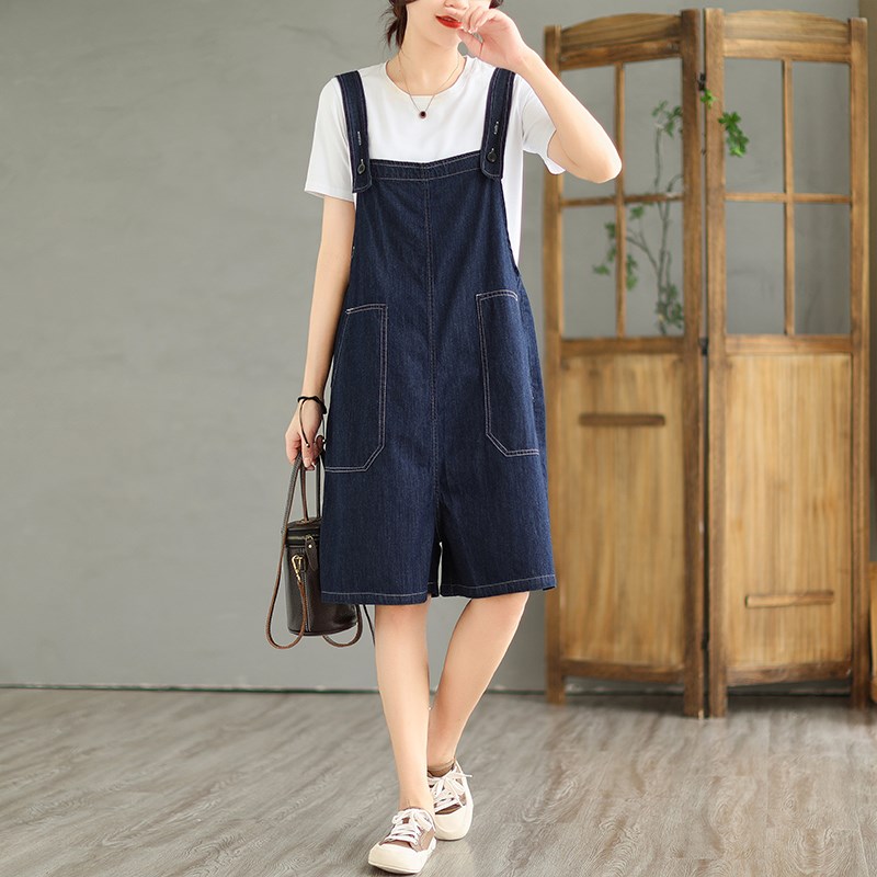 大码胖mm大口袋宽松牛仔背带短裤女夏季显瘦五分裤吊带连体阔腿裤