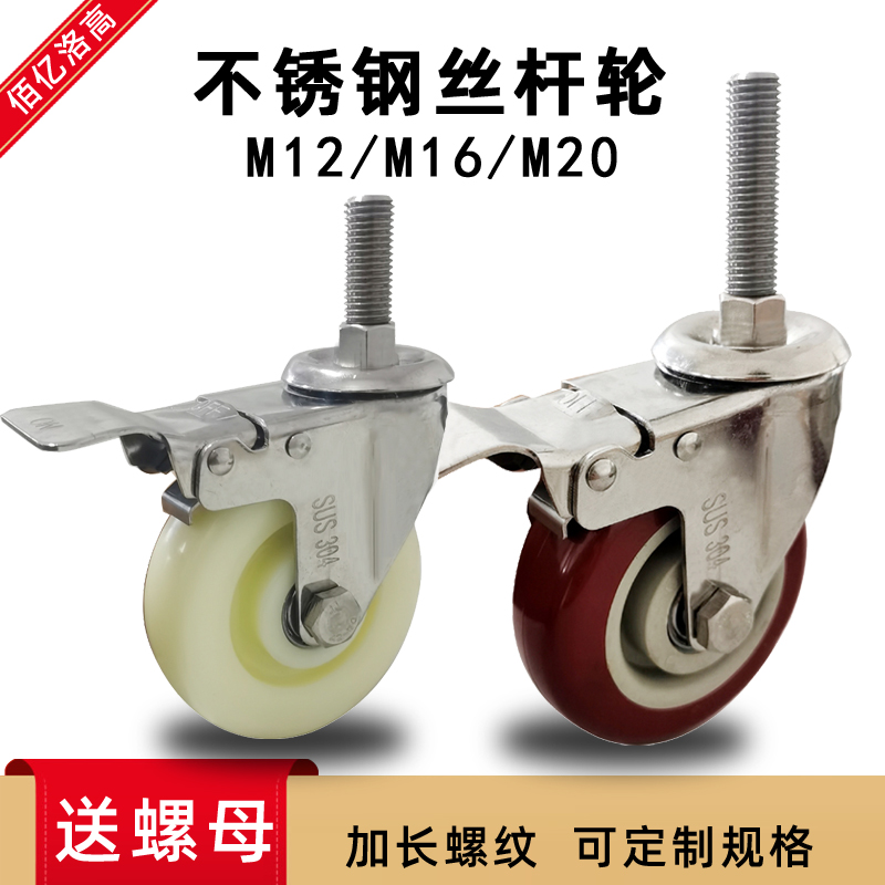 304不锈钢丝杆轮加长螺纹万向轮脚轮冷库尼龙耐磨机械聚氨酯轮子