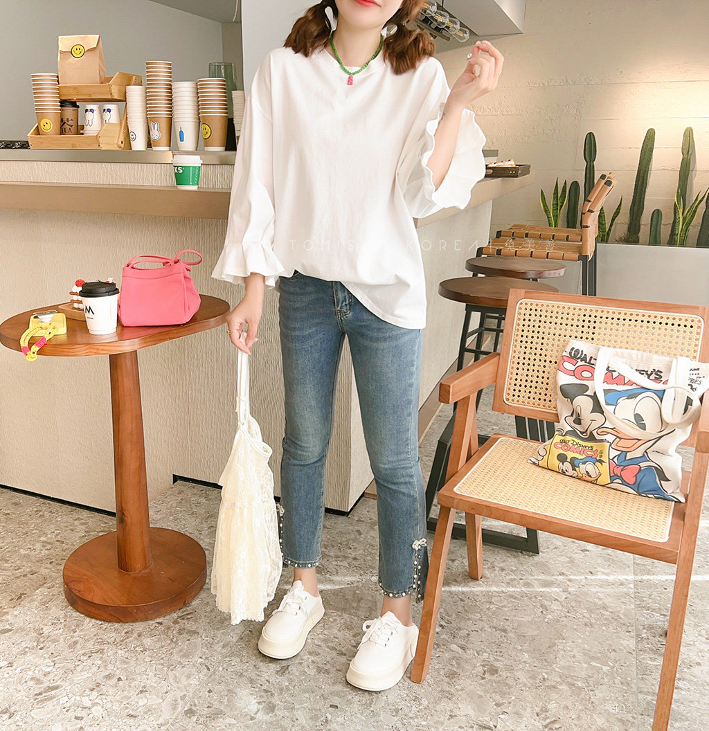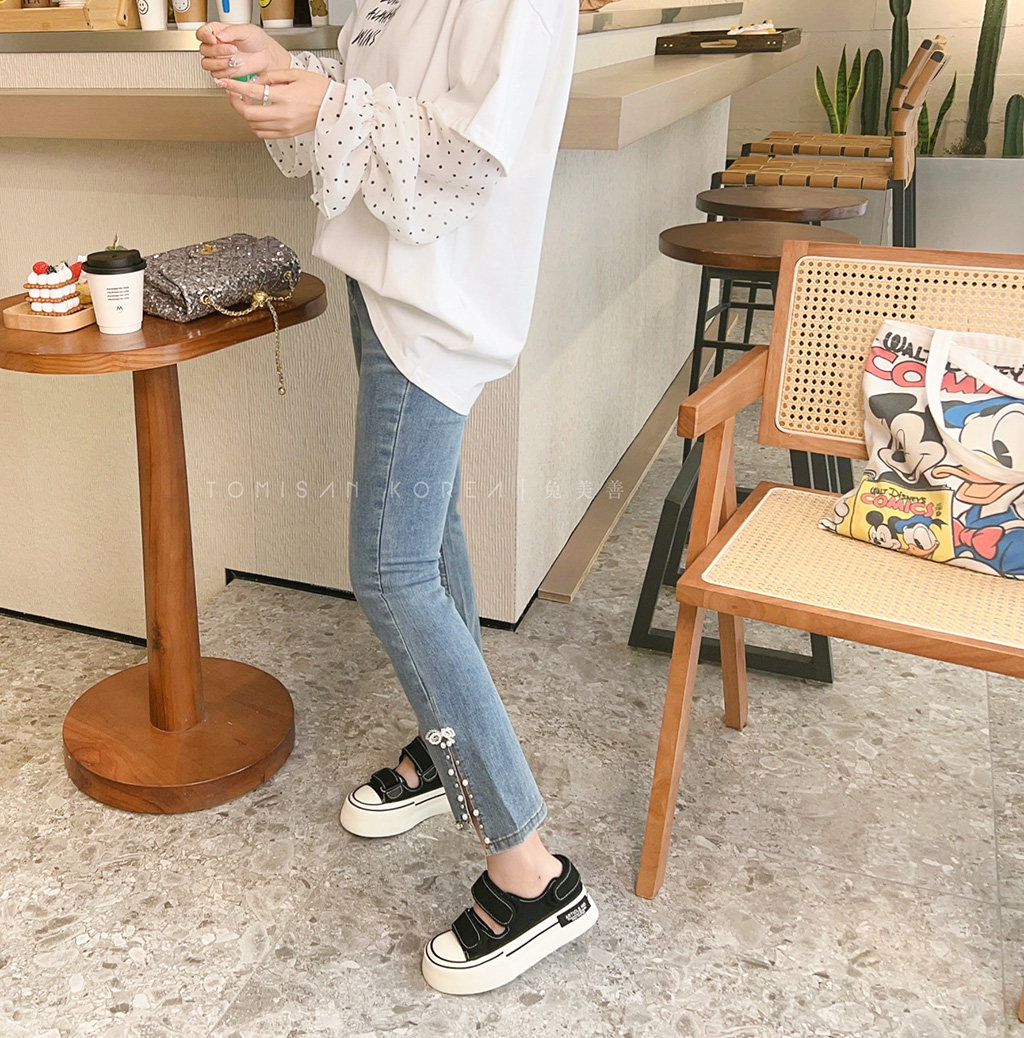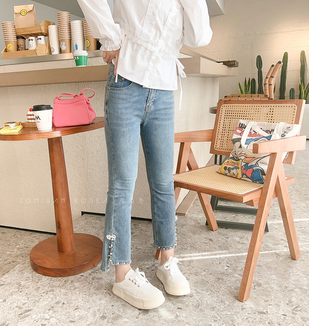 兔美善韩国代购女装 春新 时尚重工钉珠立体蝴蝶结9分开叉牛仔裤