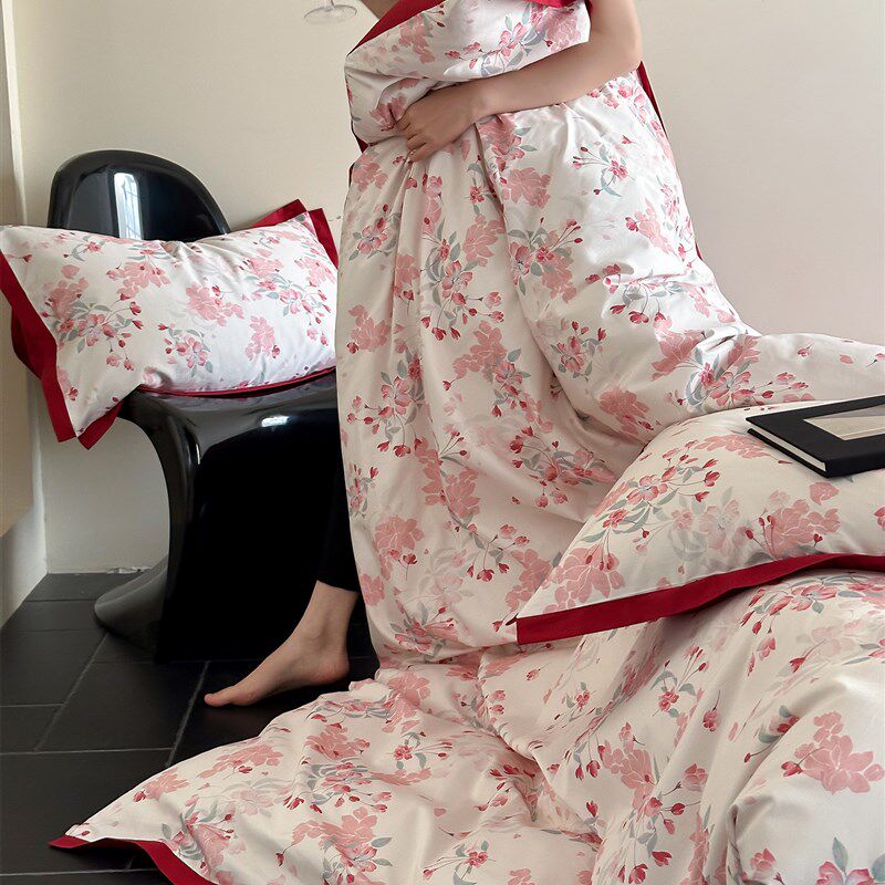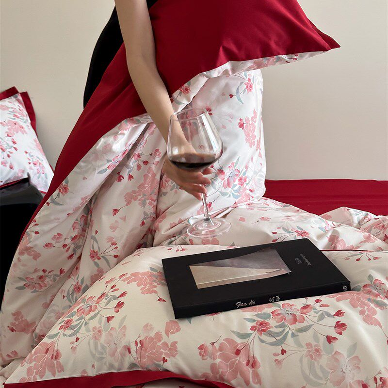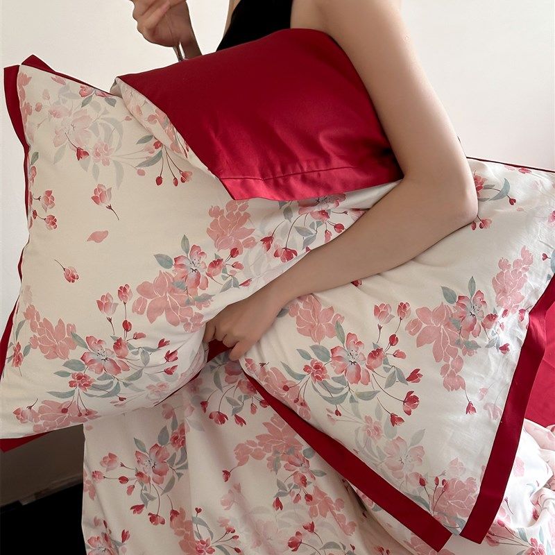 海棠印花棉布婚礼四件套套装1000s长绒棉双面红色婚礼被套床单及