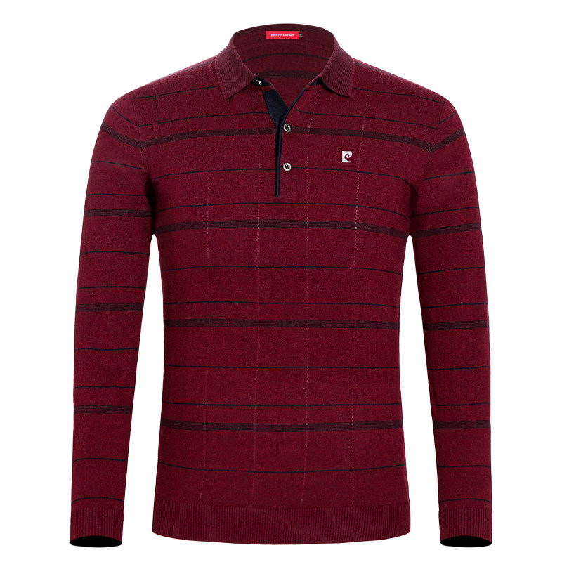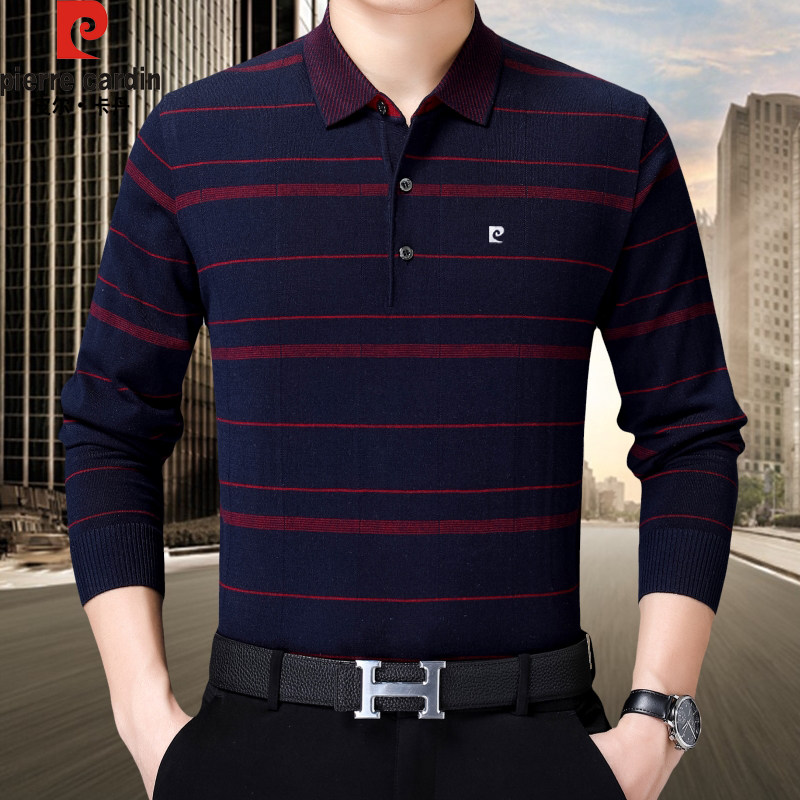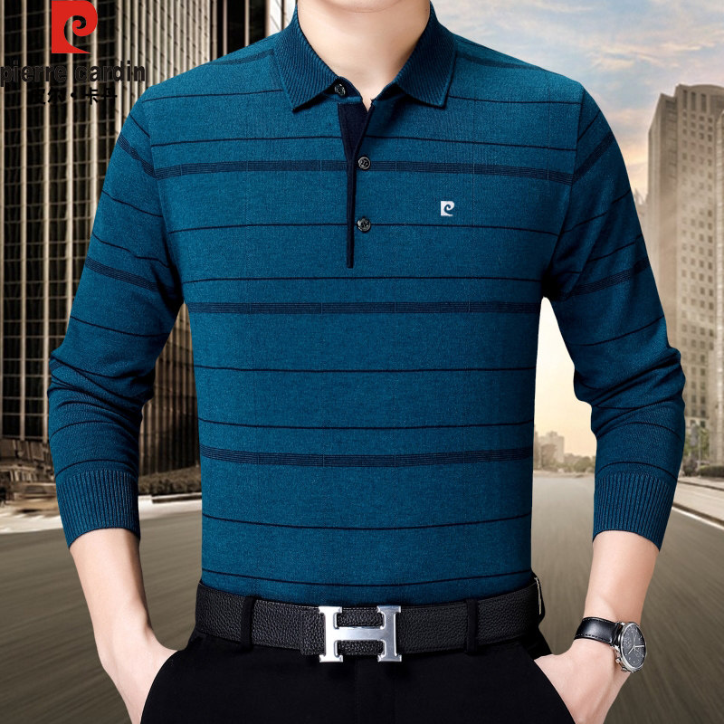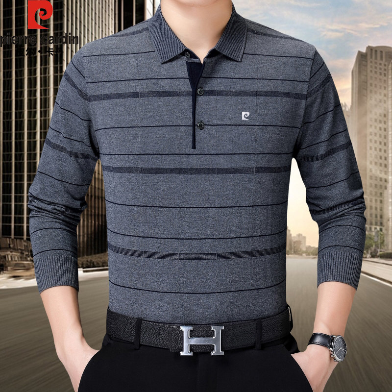 皮尔卡丹名牌男士桑蚕丝长袖t恤中老年翻领上衣爸爸薄款条纹体恤