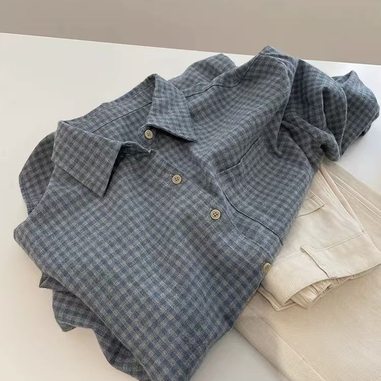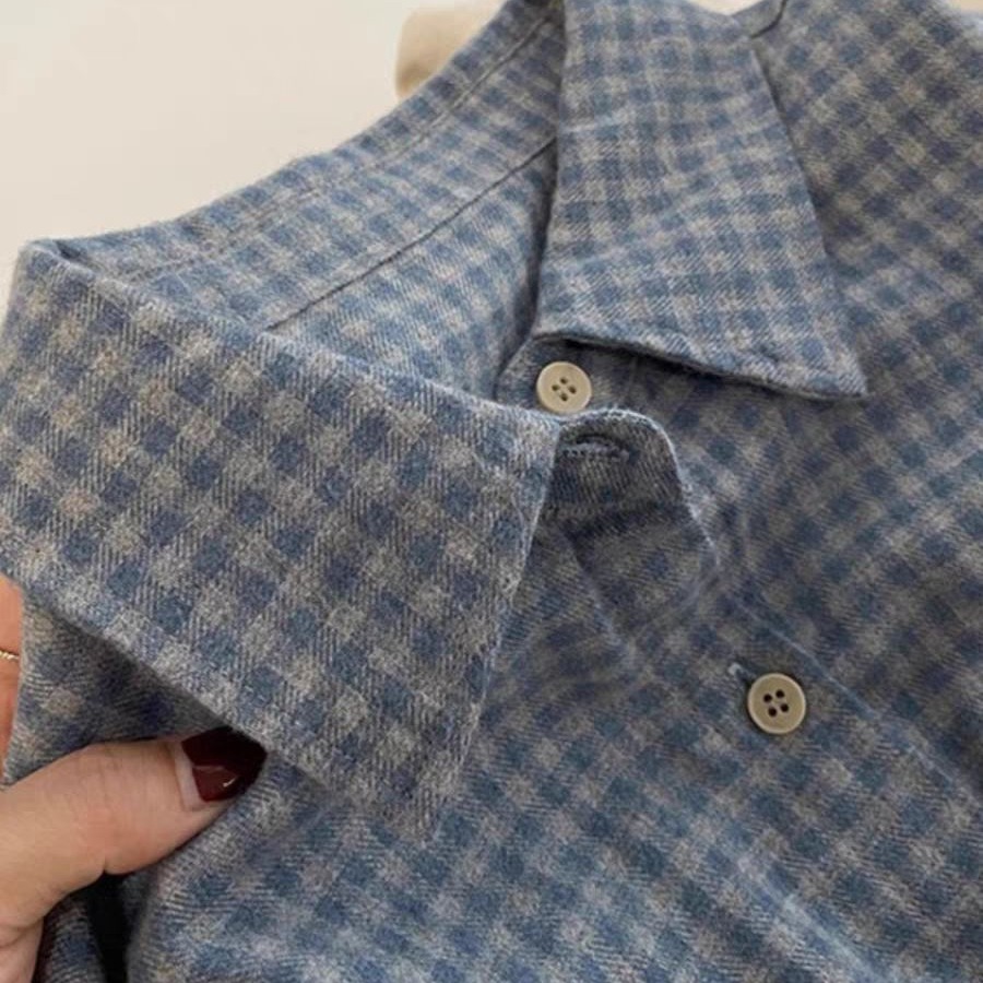 复古水洗磨毛蓝色格子衬衫外套女春秋加厚宽松休闲外搭叠穿上衣潮