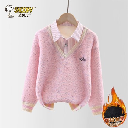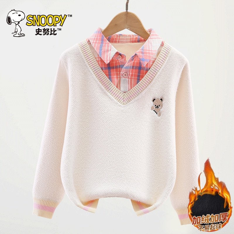 史努比男女童学院风假两件毛衣2025秋冬打底针织衫加绒加厚卫衣