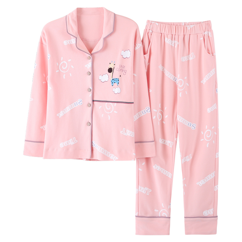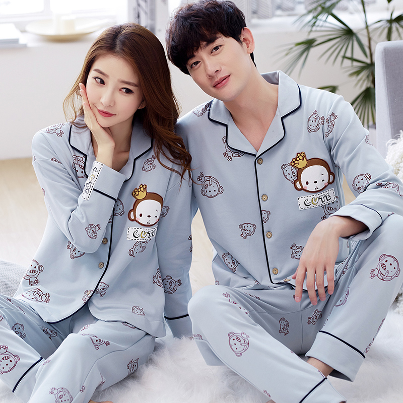浪莎春秋季休闲情侣睡衣女长袖纯棉开衫可爱套装男士大码家居服