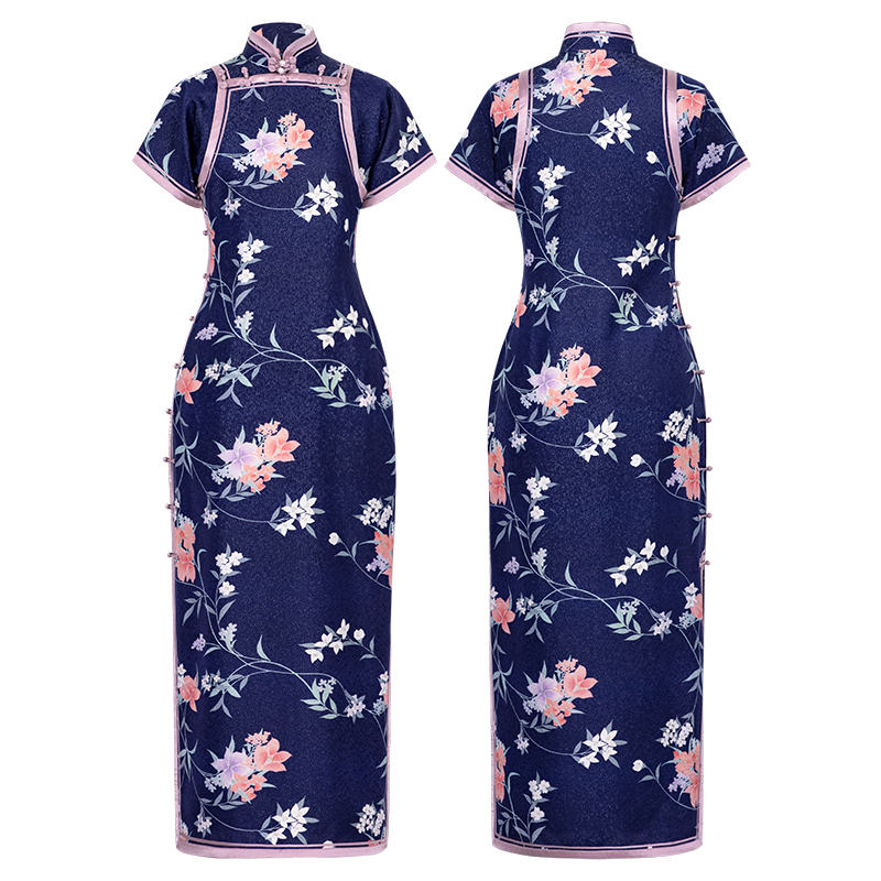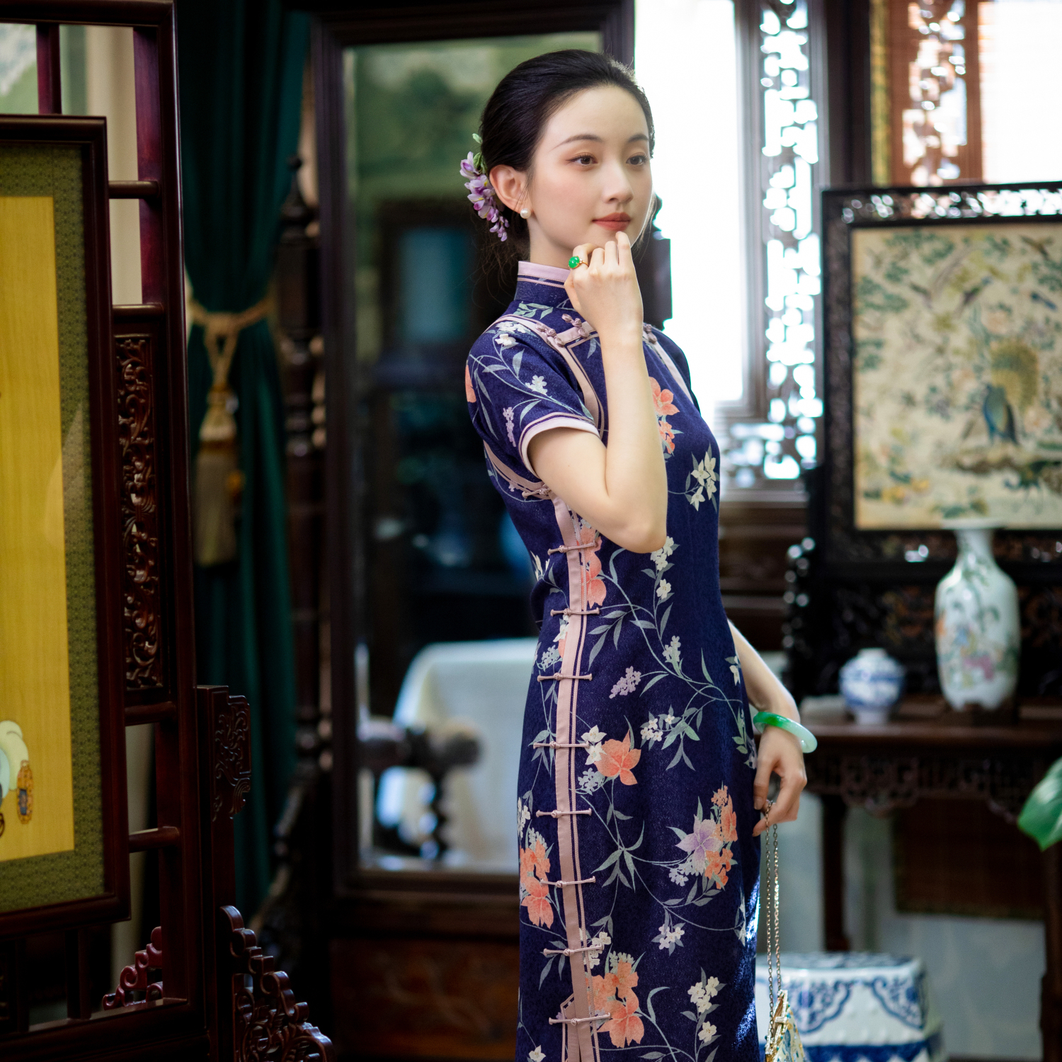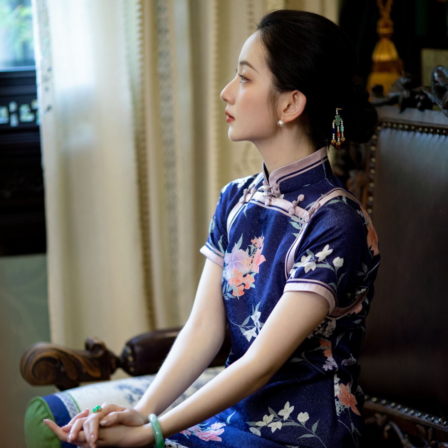 锦年芳芷丨一城风絮丨夏季真丝交织复古印花一字襟假两件短袖旗袍