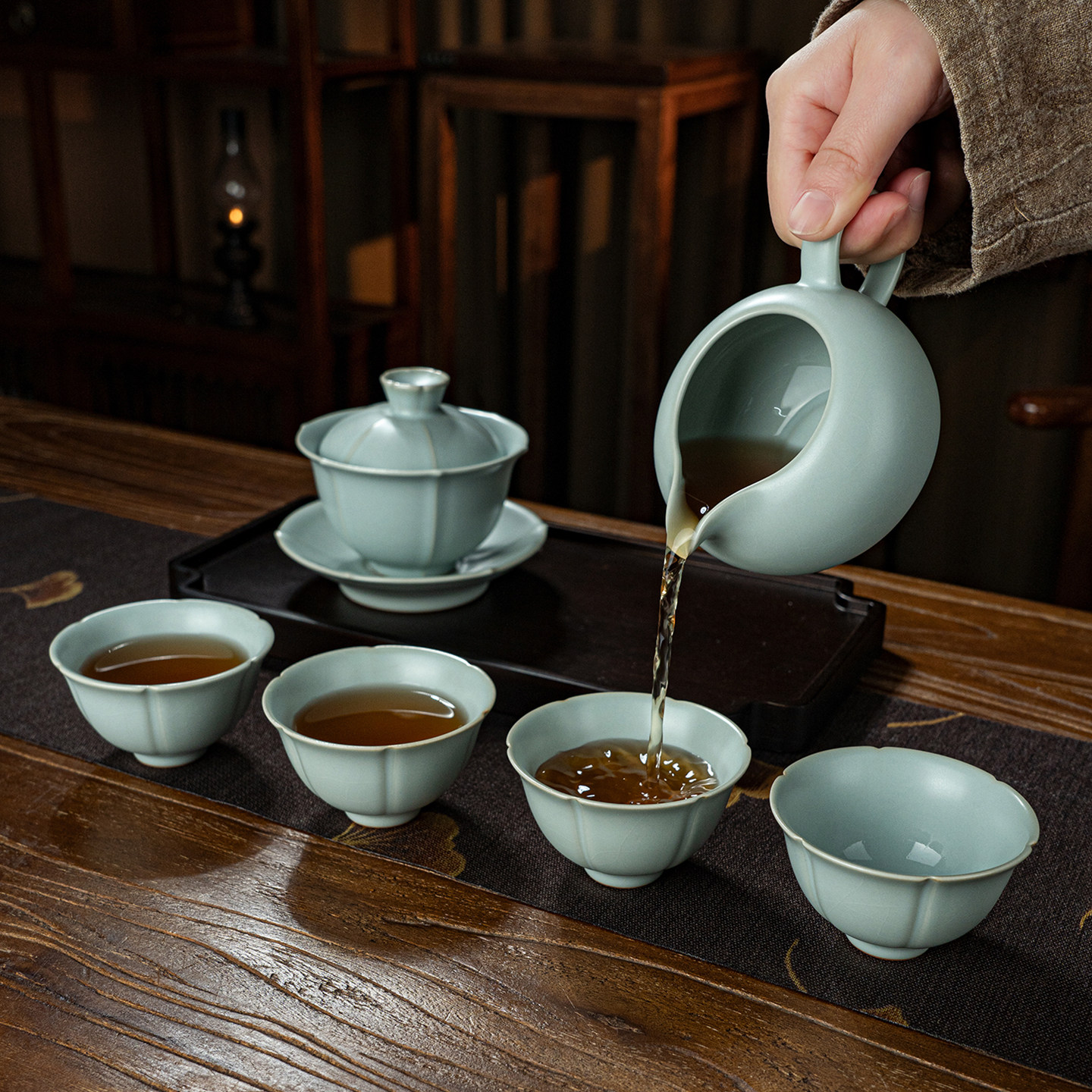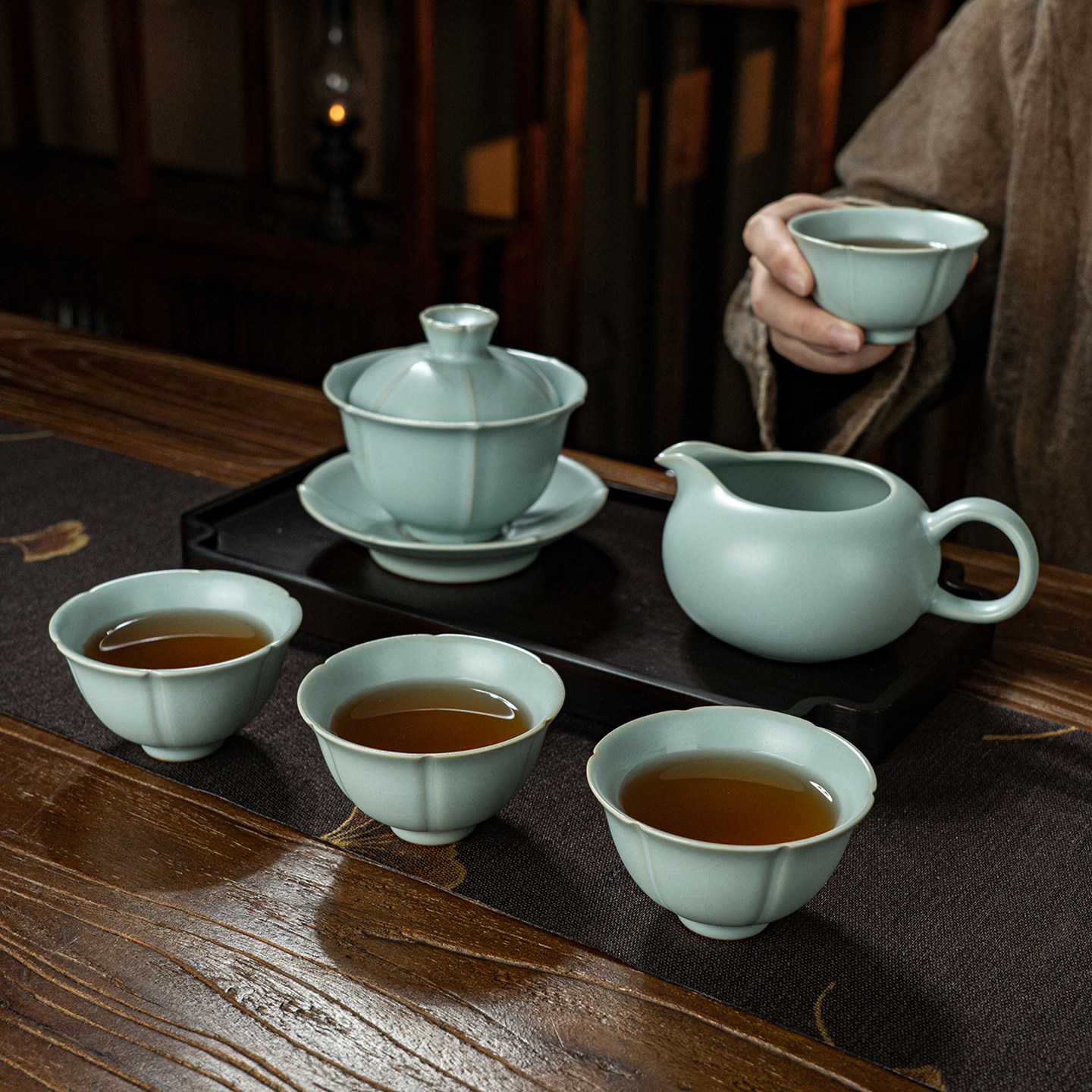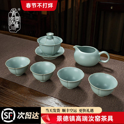 青澹汝窑三才盖碗茶杯景德镇陶瓷家用功夫茶具汝瓷复古青瓷礼盒装