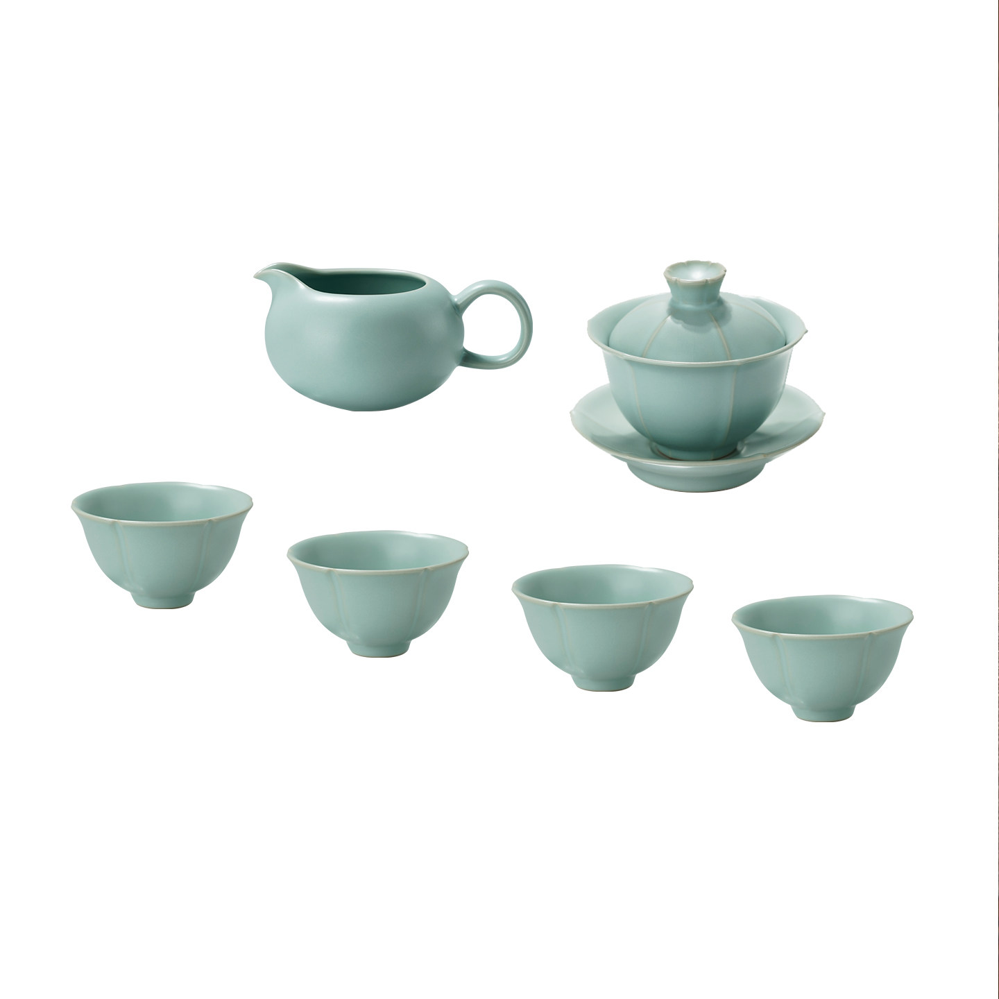 青澹汝窑三才盖碗茶杯景德镇陶瓷